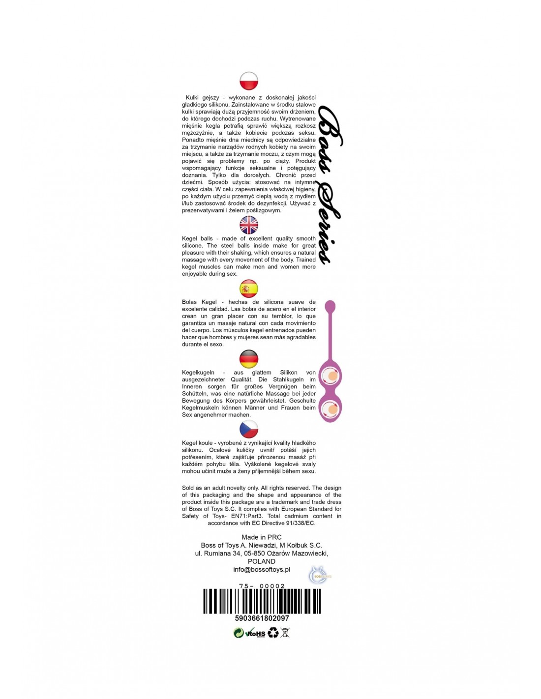 Do produkcji gadżetów i akcesoriów erotycznych marki Boss Series wykorzystuje się wyłącznie materiały najwyższej jakości, gwarantujące pełne bezpieczeństwo użytkownika, wolne od ftalanów i łatwe w utrzymaniu w czystości. Wszystkie produkty tej marki zgodne są z europejskimi normami dla bezpieczeństwa zabawek erotycznych - EN71:Art3.