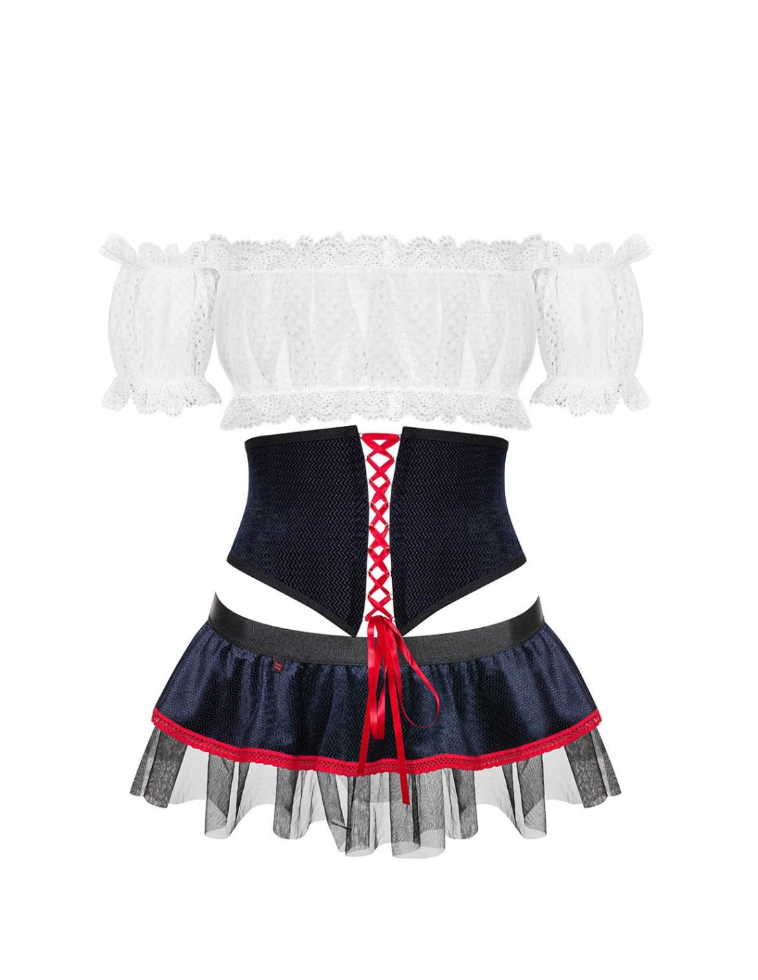 Pas w talii z czerwonym wiązaniem dodaje kostiumowi jeszcze więcej uroku, podkreślając Twoje kobiece kształty. Spódniczka z tasiemką w pasie pięknie wyeksponuje Twoje pośladki, sprawiając, że będziesz wyglądać jeszcze bardziej kusząco. Dodatkowo, kostium zawiera białe stringi, które są klasycznym dodatkiem do tego niezwykłego zestawu.