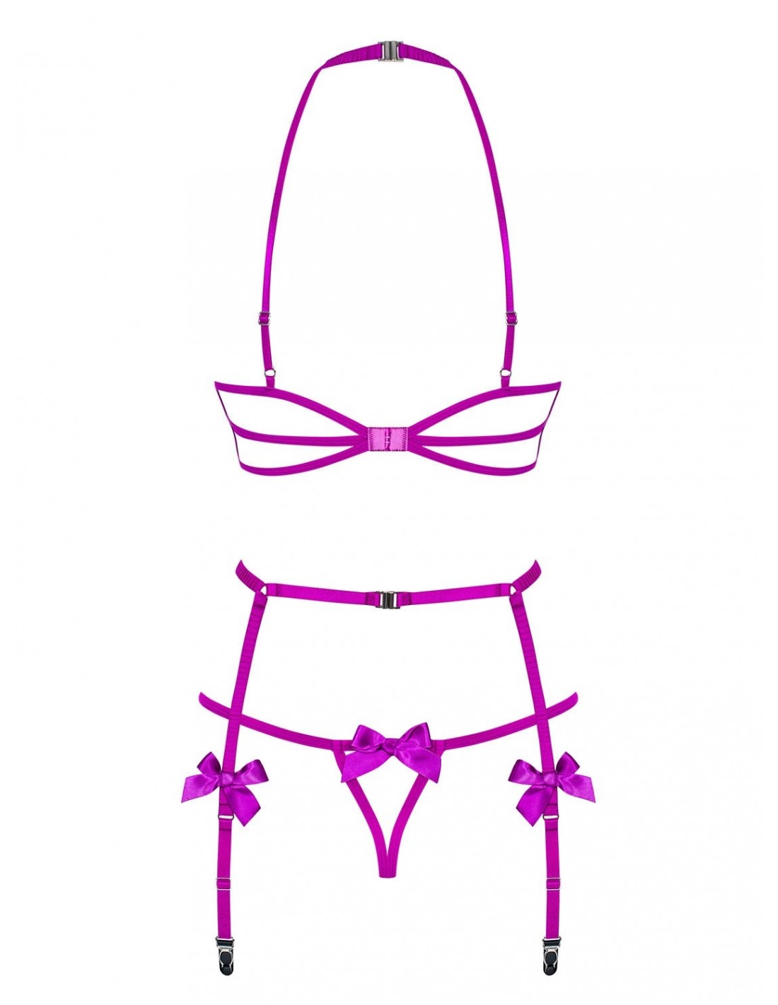 Ten wyjątkowy komplet bielizny wyróżnia się nie tylko swoim kobiecym kolorem, ale również niewinnymi kokardkami, które dodają mu uroku i pozornie grzecznego charakteru. Otwarty półbiustonosz to idealny wybór dla tych, którzy lubią prowokować i rozpalać zmysły już na samym początku. Całość składa się z paseczków, które dodają kompletowi pikantnego charakteru i sprawiają, że wyglądasz niezwykle kusząco.