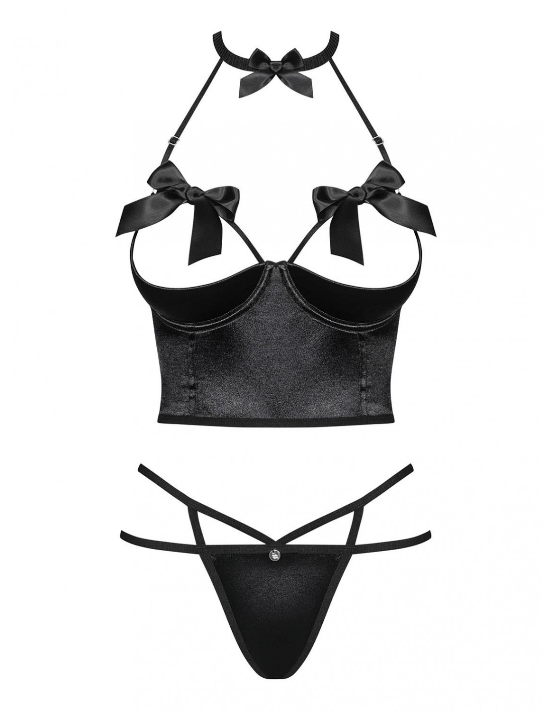 Otwarte miseczki z fiszbinami nie tylko dodają seksownego wyglądu, ale także zapewniają świetne podtrzymanie biustu. Wygodne usztywnienie miseczek zapewnia dodatkowe wsparcie i komfort. Stringi z elastycznymi paseczkami idealnie dopasowują się do Twoich bioder, podkreślając ich zmysłowy wygląd.