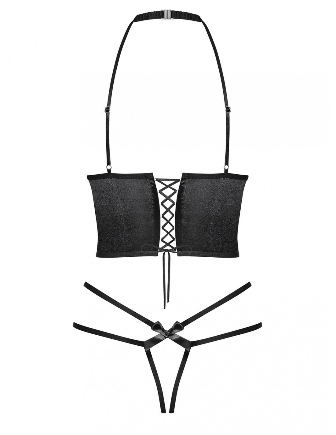 Nasz komplet bielizny Delishya wyróżnia się nie tylko swoim seksownym wyglądem, ale także unikalnymi detalami. Choker z satynową kokardką dodaje kompletowi wyjątkowego uroku, podczas gdy regulowane ramiączka na przodzie i tyle zapewniają idealne dopasowanie. Gorsetowe wiązanie na plecach dodaje nie tylko seksapilu, ale także świetnie podkreśla Twoje krągłości.