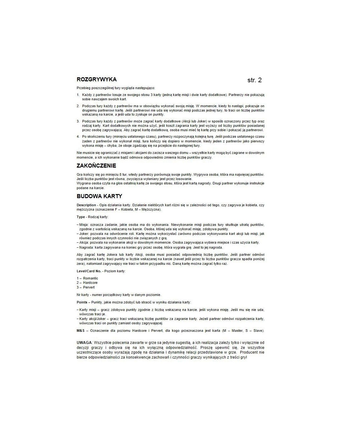Zanim rozpoczniecie grę, koniecznie przeczytajcie reguły, które znajdują się na stronie thelovers.eu. Pamiętajcie, że karty nie mogą być podglądane, aby zachować niespodziankę i pełne zaskoczenie. The Lovers - Ekskluzywna Gra Erotyczna to idealny prezent na wieczór kawalerski, panieński, walentynki czy rocznicę. Nie wstydź się, gra jest profesjonalnie wykonana i zapewni wam niezapomniane chwile pełne namiętności i rozkoszy.