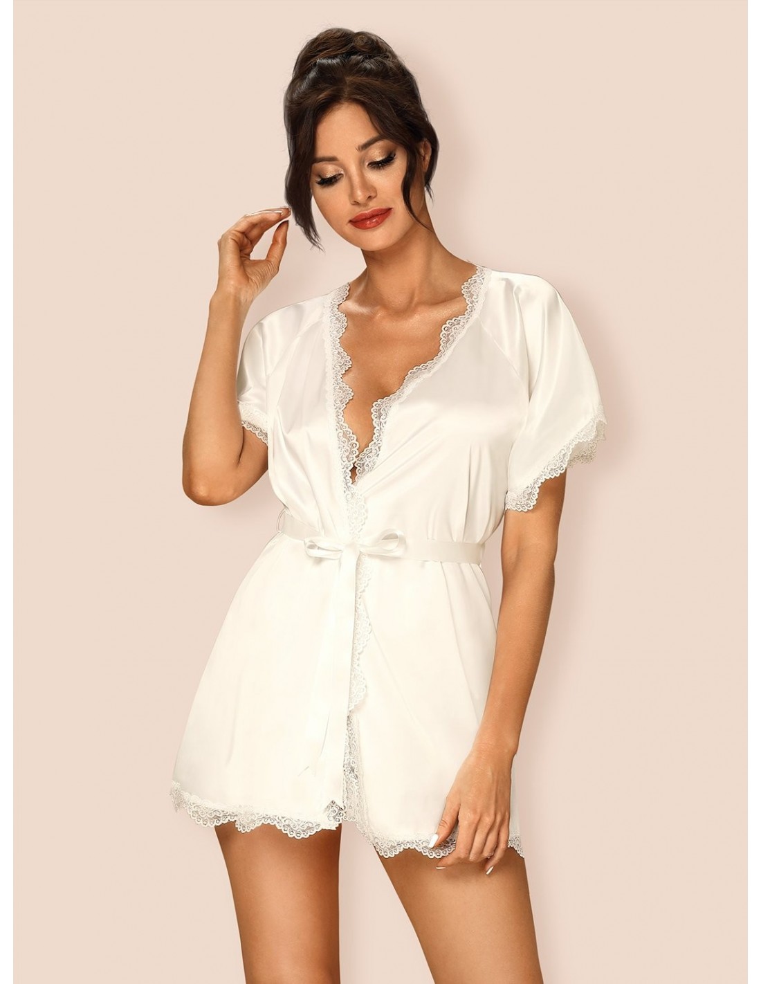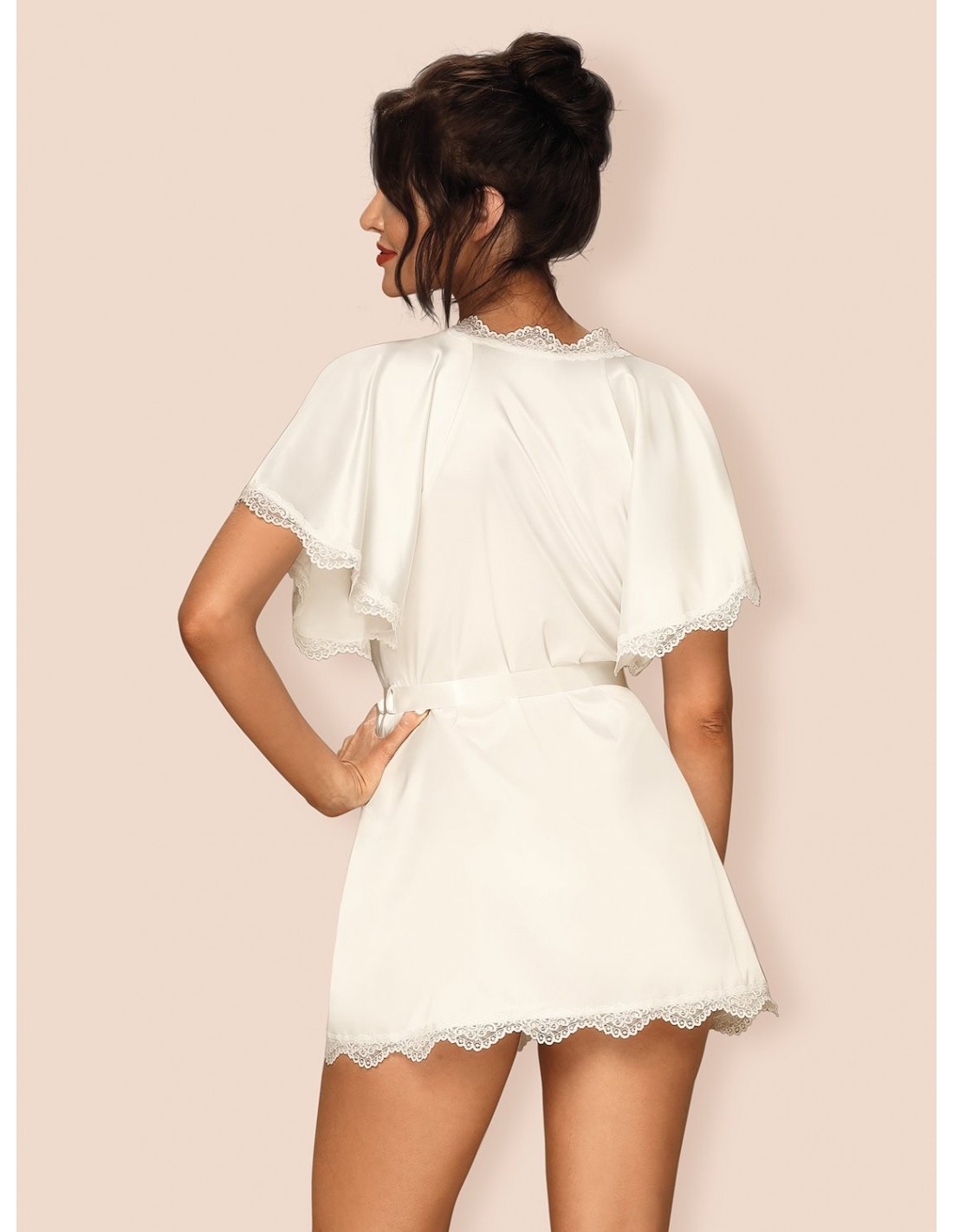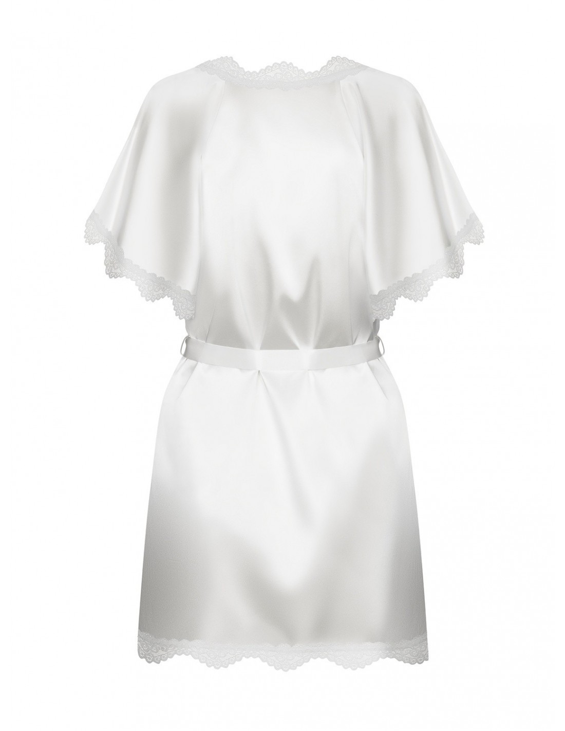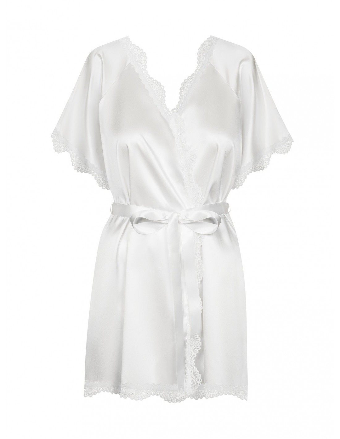 Prima Neve Peniuar Biały wykonany jest z pięknego, satynowego materiału w kolorze off white, który sprawia, że wyglądasz niezwykle zmysłowo. Koronkowe rękawki i brzegi dodają mu klasycznego uroku i elegancji, podkreślając Twoją kobiecość.