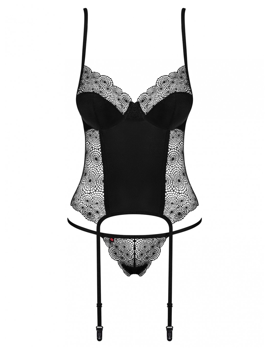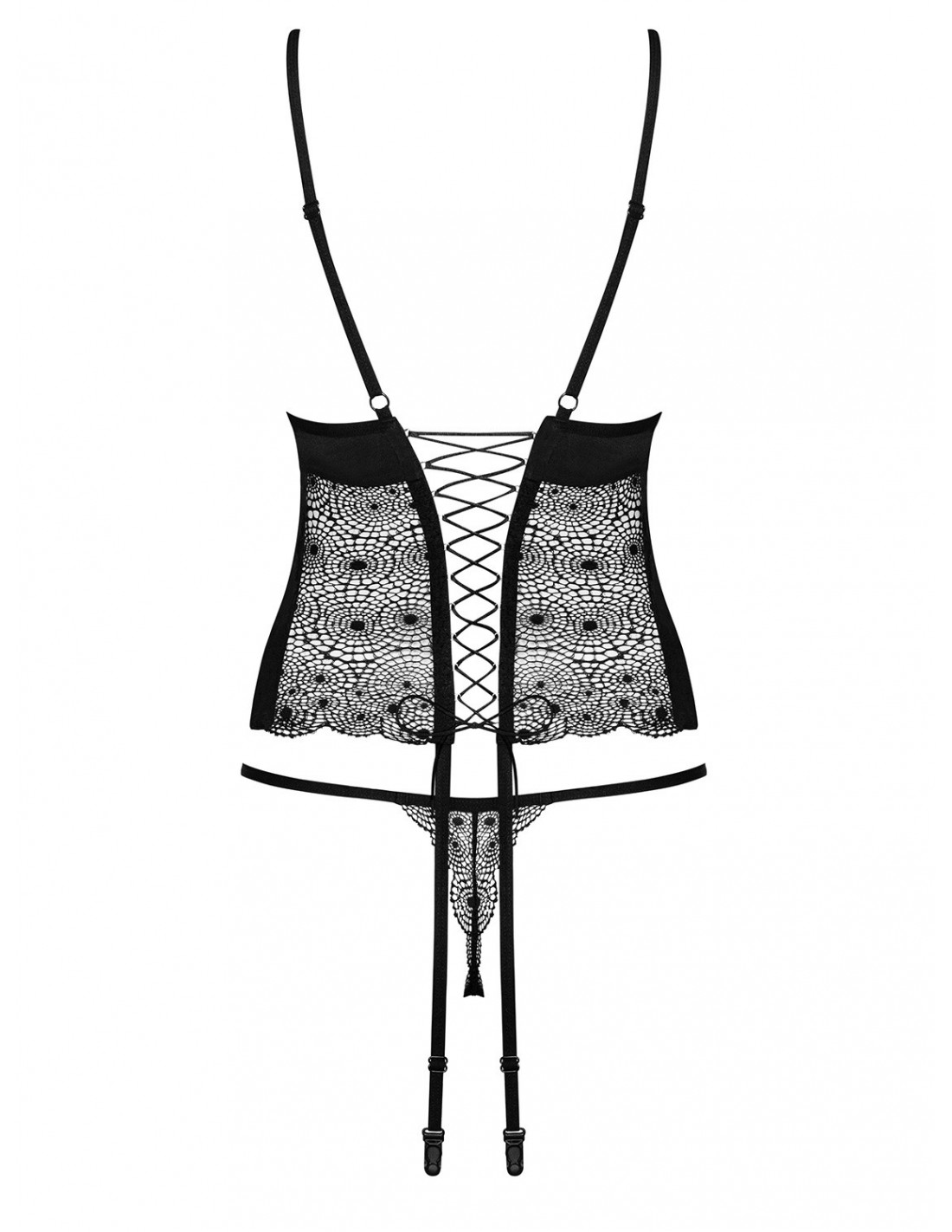 Gorset wyróżnia się hipnotyzującym wzorem koronki, który subtelnie ozdabia biust, brzuch, plecy oraz stringi. To niezwykłe połączenie sprawia, że poczujesz się niezwykle seksownie i pewnie w swojej skórze. Dodatkowo, fiszbiny w miękkich miseczkach zapewniają komfort i idealne podtrzymanie biustu, a regulowane ramiączka pozwalają na indywidualne dopasowanie do Twoich preferencji.