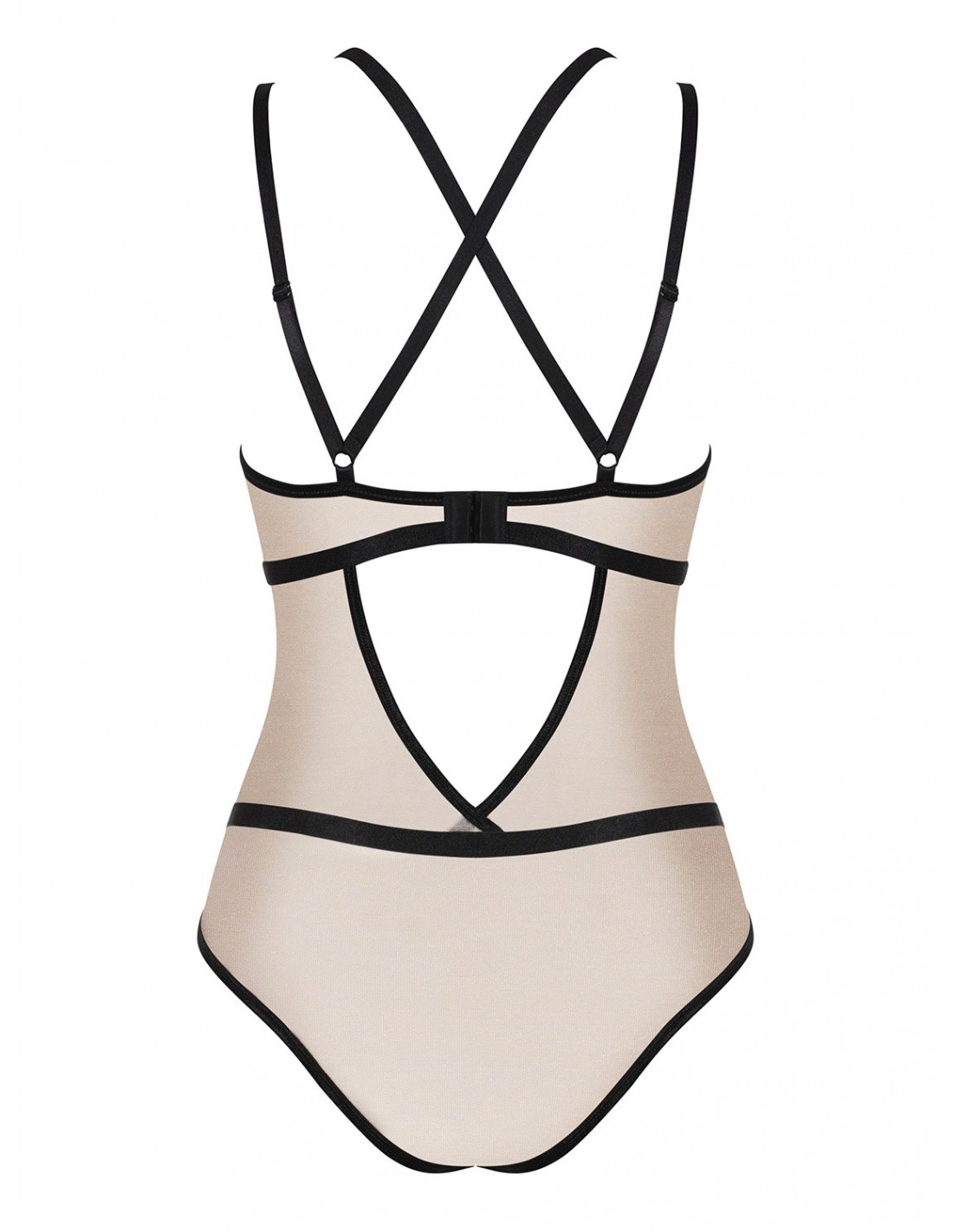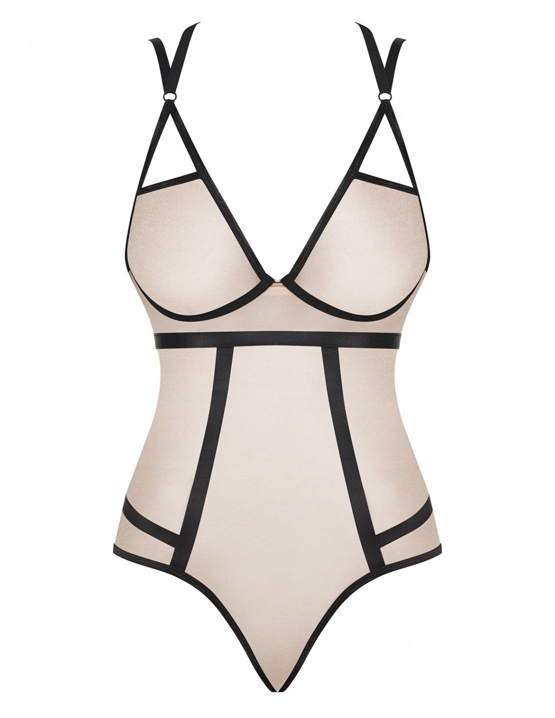 Nudelia Body to połączenie elegancji i seksapilu. Beżowy materiał przeszyty złotą nitką dodaje mu luksusowego charakteru, a czarne paski zdobiące plecy subtelnie wysmuklają Twoją sylwetkę. Trójkątne wycięcia nad piersiami przyciągają uwagę na biust, podkreślając go w sposób niezwykle zmysłowy.