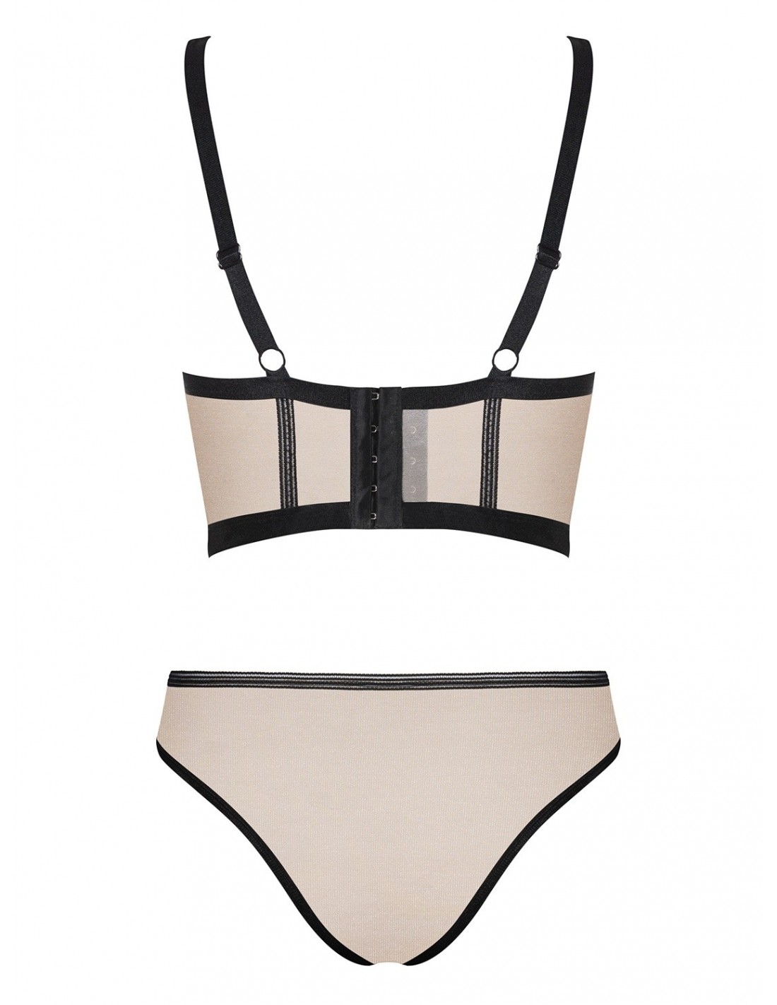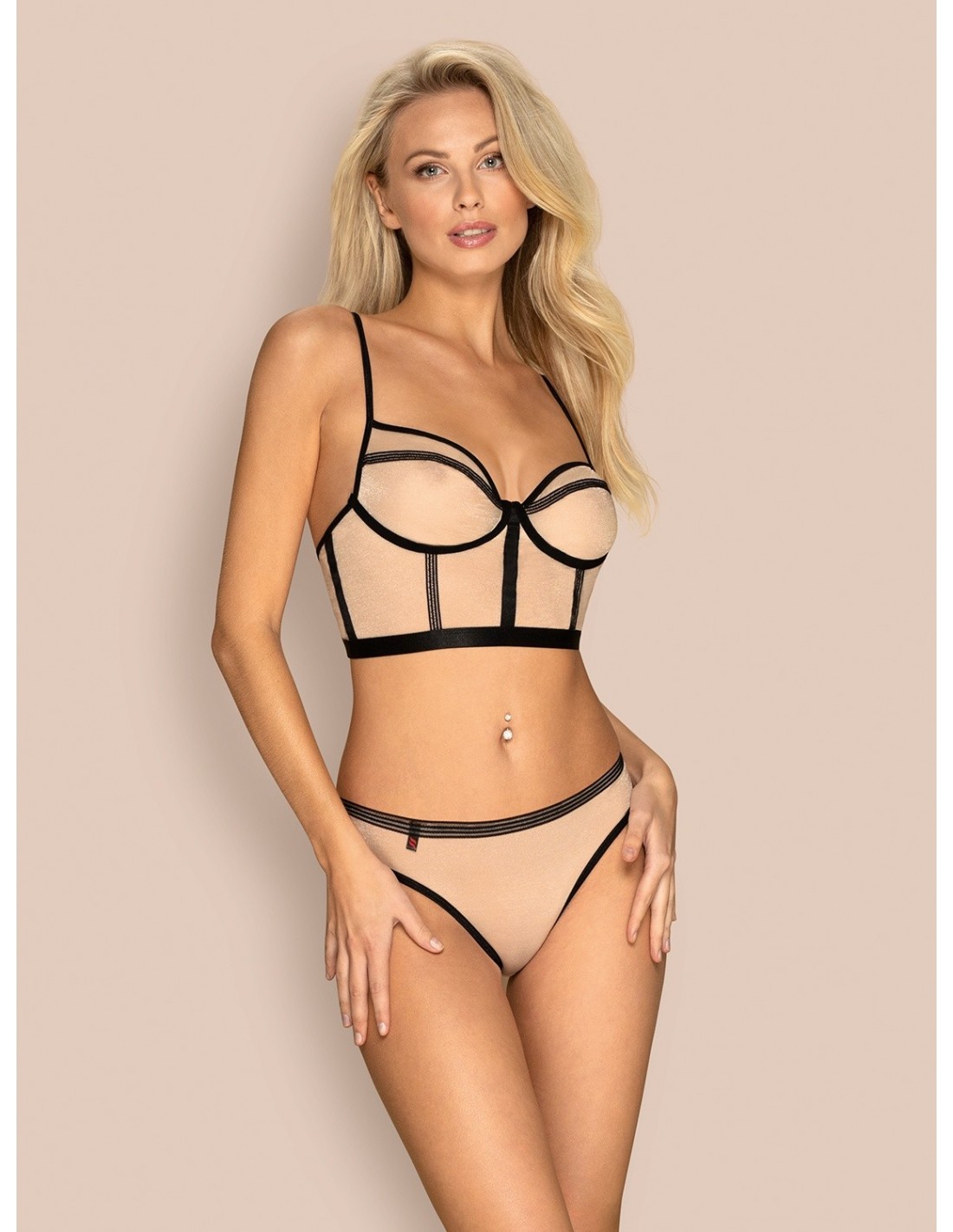 Prześwitujący materiał przeszyty złotą nitką nadaje temu kompletowi niezwykłego uroku i elegancji. Czarne paseczki, które zdobią ten komplet, dodają mu pikantności i zmysłowości. To połączenie subtelności i wyrafinowania sprawi, że poczujesz się naprawdę zjawiskowo.