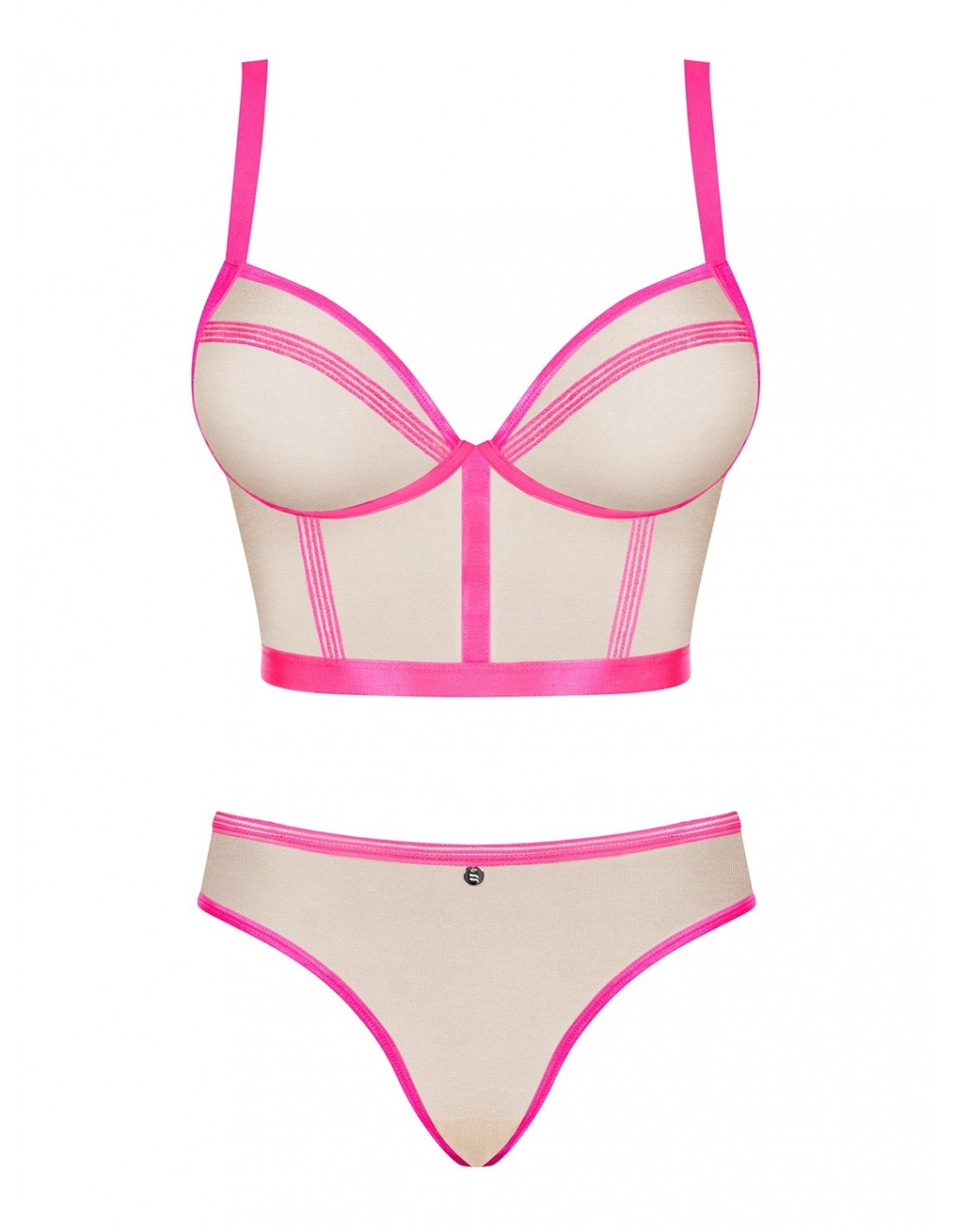 Prześwitujący materiał kompletu subtelnie podkreśla Twoje piersi, dodając im niepowtarzalnego uroku. Złota nitka wszyta w materiał nadaje mu niezwykłego blasku i piękna. Neonowe paseczki, które zdobią całość, dodają mu niebanalnego charakteru.