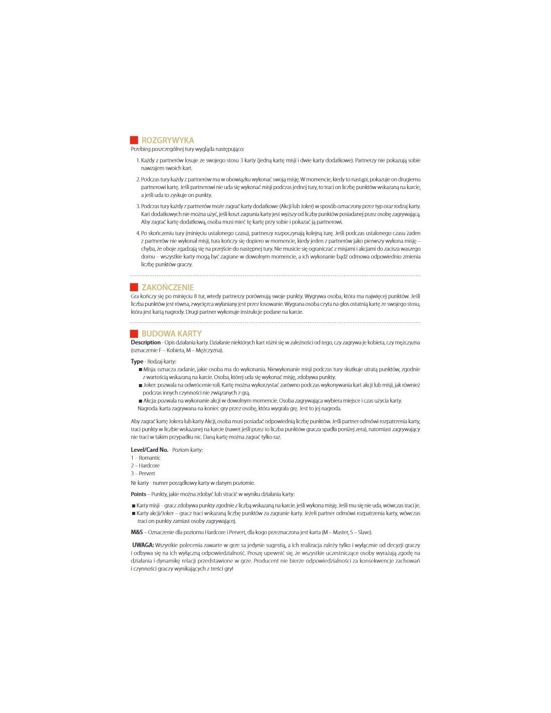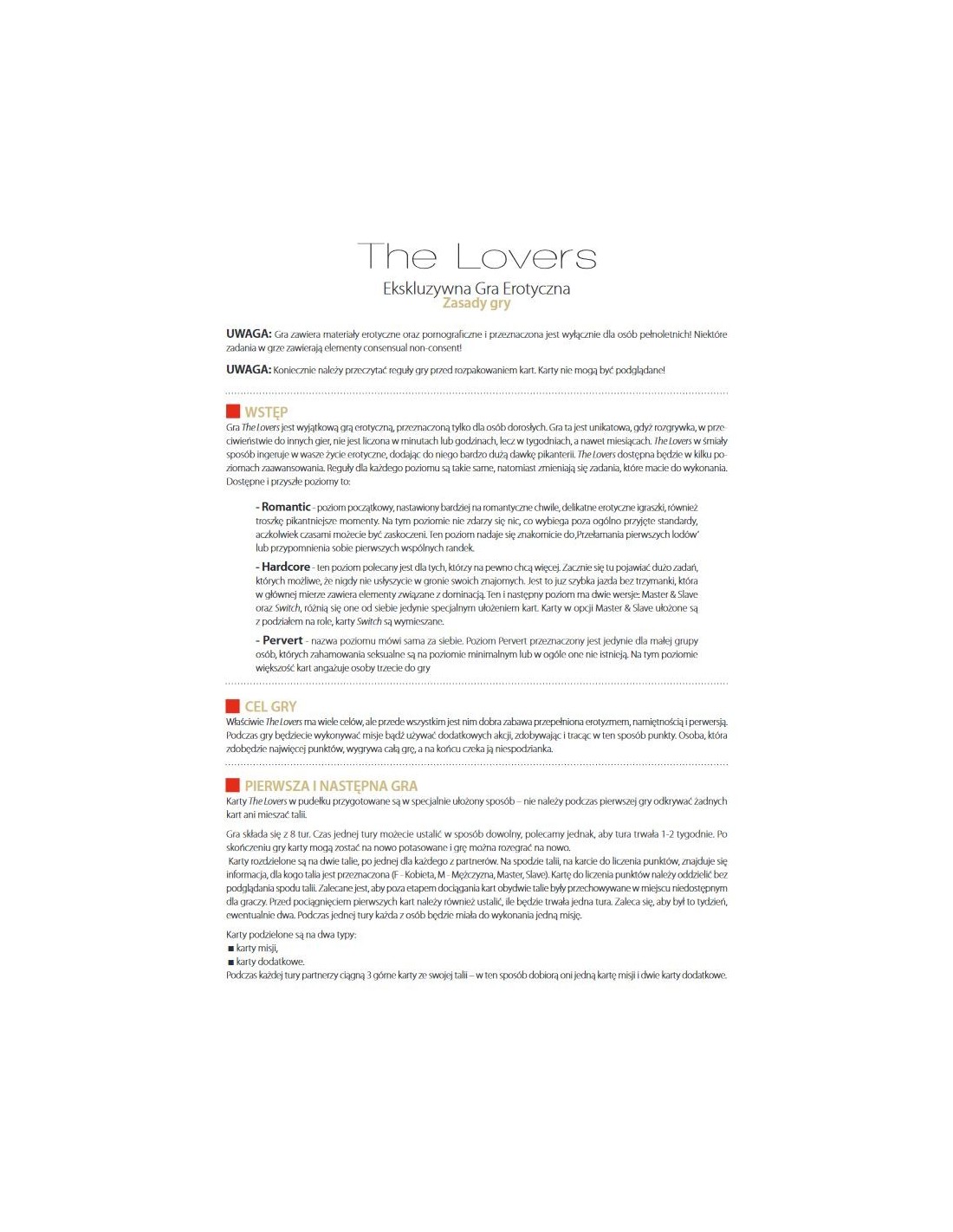 The Lovers to niezwykła gra erotyczna, która przeniesie Cię w świat pełen namiętności i poddania się. Jej rozgrywka nie jest liczona w minutach czy godzinach, ale w tygodniach, a nawet miesiącach. Przeżyj niezapomniane chwile pełne emocji i odkryj nowe oblicze swojej seksualności. Pamiętaj jednak, że przed rozpoczęciem gry koniecznie przeczytaj reguły i pamiętaj, że karty nie mogą być podglądane!
