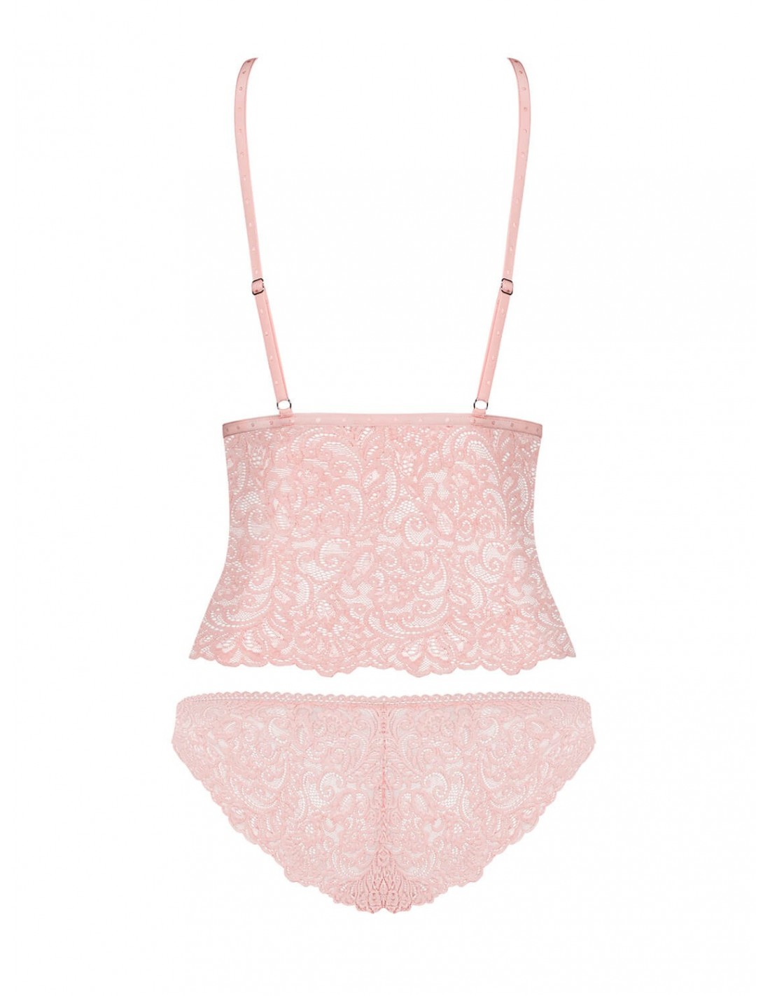 Ten komplet bielizny to połączenie wyjątkowej elegancji i pikantnego stylu. Koronkowy materiał, delikatny w dotyku, subtelnie podkreśla Twoje kobiece kształty. Miseczki w trójkątnym kształcie i satynowy pasek pod biustem dodają uroku i podkreślają biust. Regulowane ramiączka zapewniają idealne dopasowanie, a stringi z kokardkami po bokach nadają całości niezwykle kobiecego wyglądu.