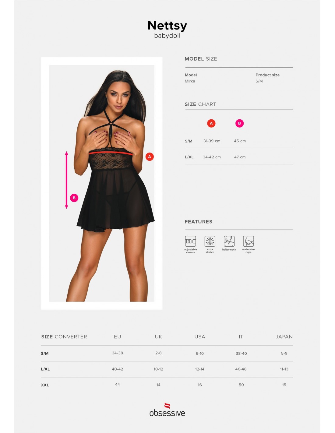 - Otwarte miseczki i czarne paski nadają tej babydoll oryginalny wygląd, który przyciąga spojrzenia i budzi pożądanie.