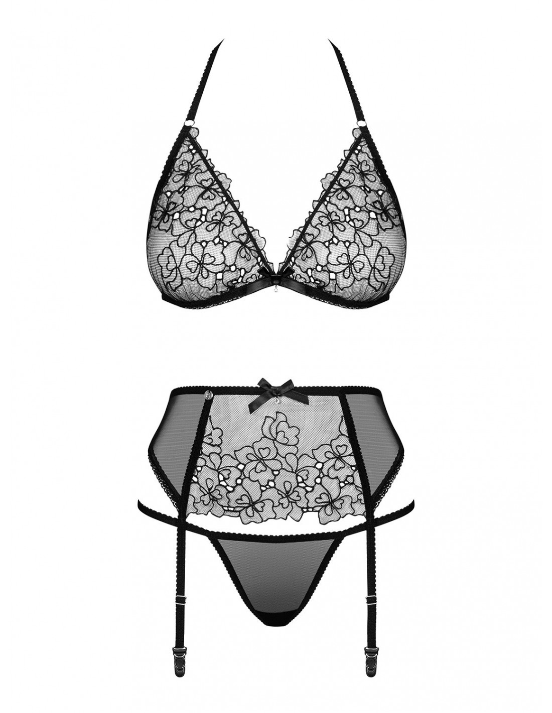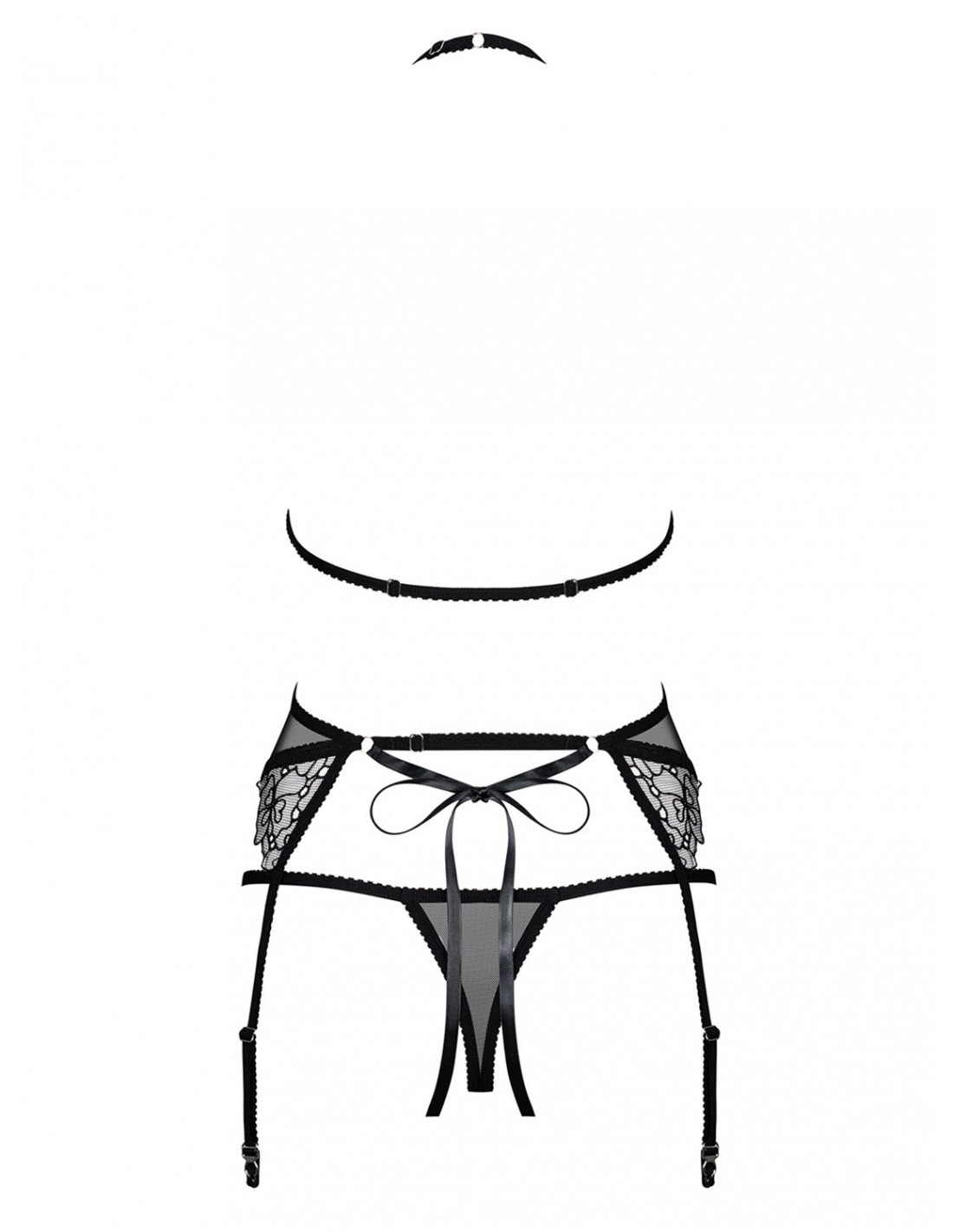 Zestaw składa się z miękkiego biustonosza ozdobionego kwiatowym wzorem, mega seksownych stringów podkreślających pośladki oraz pasa do pończoch z regulacją i wiązaniem na plecach, zapewniającego komfort i wygodę. Ramiączko zakładane na szyję dodaje całości niezwykłego uroku i przyciąga wzrok.