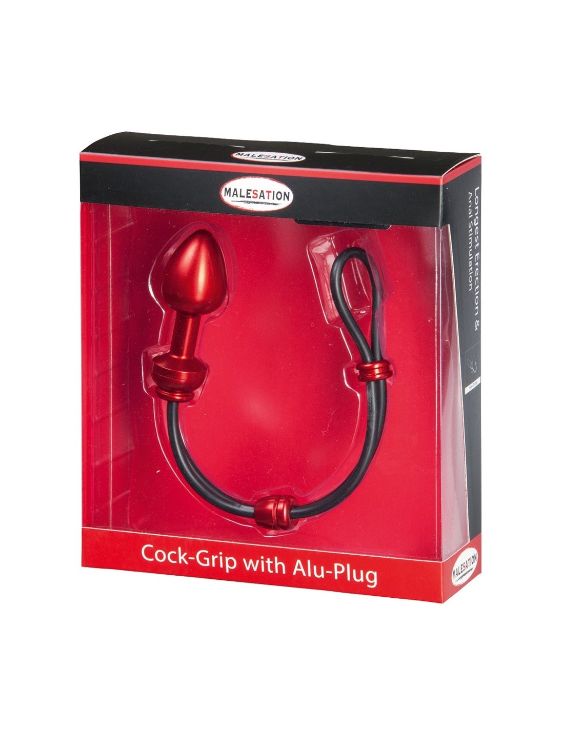Zwiększ swoją przyjemność i wytrzymałość z pierścieniem erekcyjnym Malesation Cock-Grip With Alu-Plug Large, Red