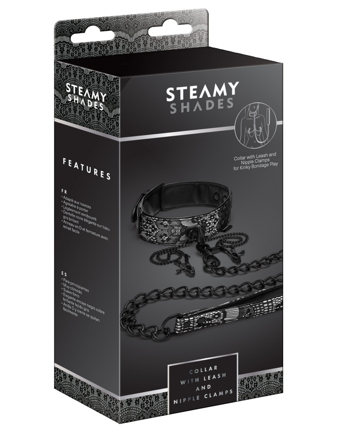 STEAMY SHADESPodkreśl swoją dominację z naszymi klamrami na sutki Steamy Shades Collar With Leash And Nipple Clamps