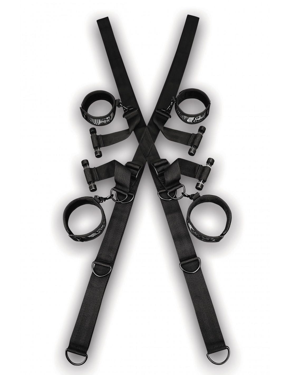 Ta wyjątkowa uprząż została zaprojektowana z myślą o Twoim komforcie i bezpieczeństwie. Solidne sztangi utrzymują krzyż na miejscu nad każdymi zamkniętymi drzwiami, gwarantując stabilność i bezpieczeństwo podczas Twoich eksperymentów. Regulowane mankiety na nadgarstki i kostki zapewniają idealne dopasowanie do Twojego ciała, pozwalając Ci na wygodne i satysfakcjonujące doznania.