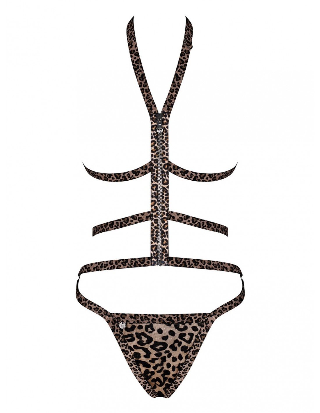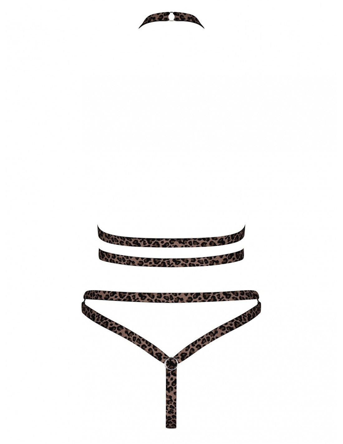 Dzięki elastycznym paseczkom w cętki, ten komplet podkreśli Twoje atuty i sprawi, że poczujesz się niezwykle atrakcyjnie. Regulowany pasek ozdobiony srebrnym zamkiem w kształcie głowy lamparta dodaje całości jeszcze większego uroku. To idealny dodatek dla kobiet, które chcą eksperymentować i wyrazić swoją seksowną naturę.