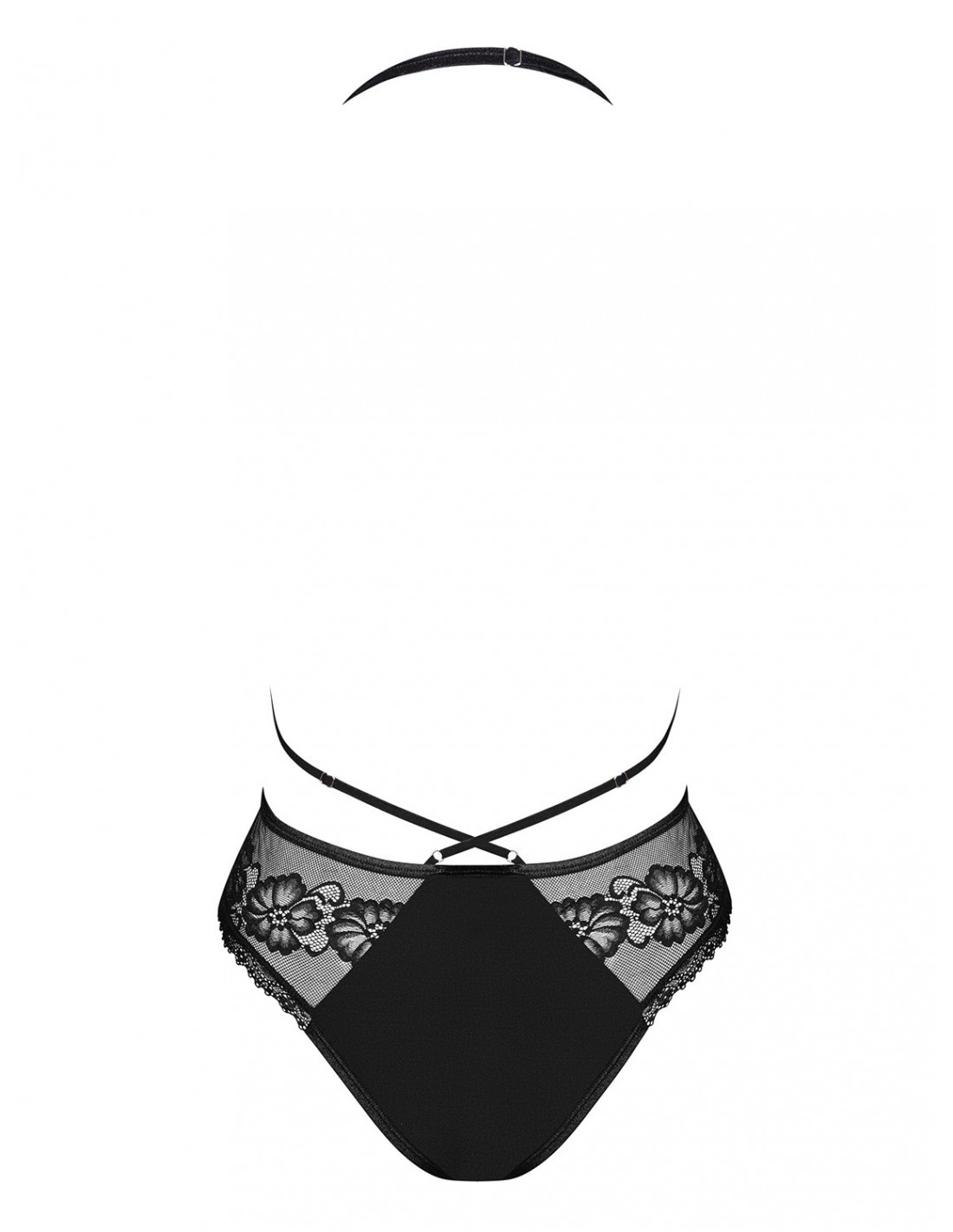 Głęboki dekolt doskonale podkreśla Twoje piękno i subtelnie eksponuje piersi, dodając Ci pewności siebie i uwodzicielskiego wyglądu. Ramiączko zakładane na szyję oraz paseczki krzyżujące się na plecach nadają temu body niepowtarzalny, oryginalny design, który wyróżnia Cię spośród tłumu.