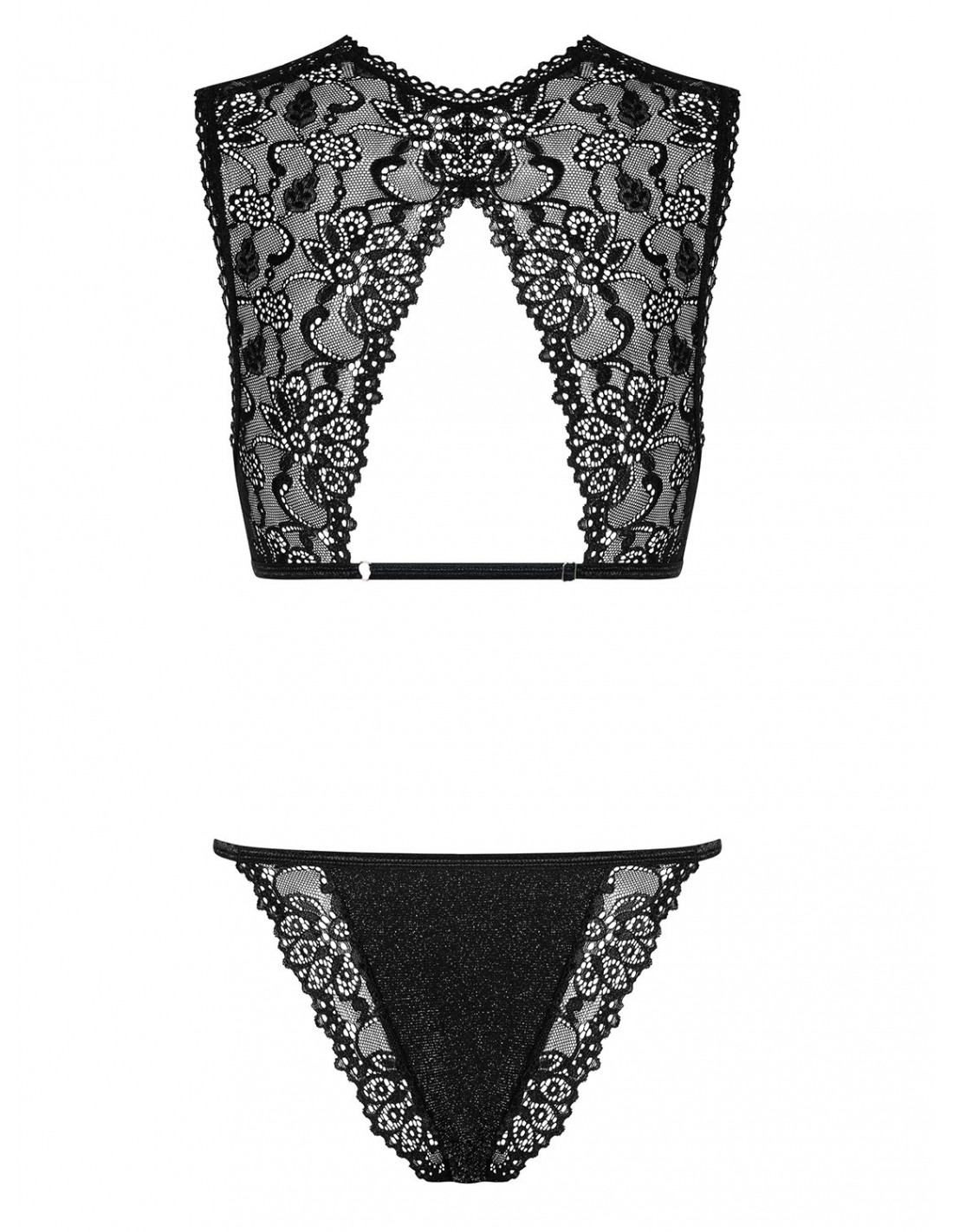 Regulowany pasek na plecach zapewnia idealne dopasowanie, podczas gdy koronkowe ramiączka tworzące geometryczne wycięcie z tyłu dodają seksownego charakteru. Miseczki zdobione kwiatowym wzorem delikatnie podkreślają Twoje piersi, a elastyczne paseczki po bokach majtek obłędnie podkreślają Twoje biodra.