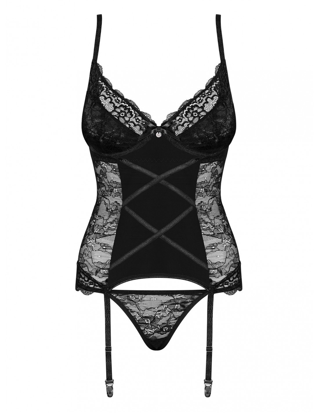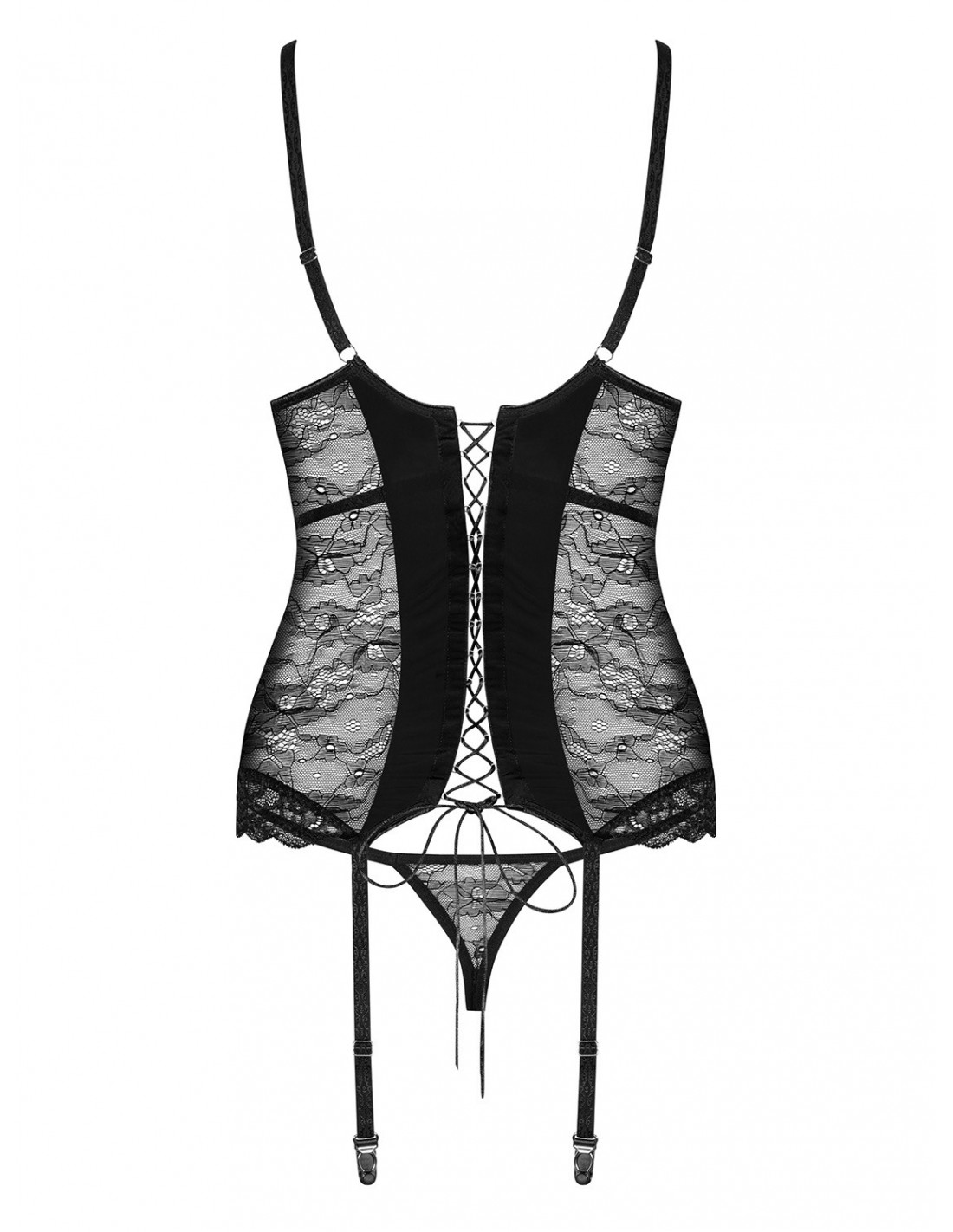 Ten gorset i stringi to połączenie prześwitującej koronki z delikatną tkaniną w kolorze czarnym. To idealny wybór dla kobiet, które pragną podkreślić swoje kobiece kształty i zaskoczyć swojego partnera. Regulowane ramiączka i paski do pończoch zapewniają idealne dopasowanie, a gorsetowe wiązanie pięknie podkreśla plecy. Miseczki z fiszbinami BigBust są stworzone specjalnie dla większych biustów, a satynowa kokardka między piersiami dodaje całości jeszcze więcej seksapilu.