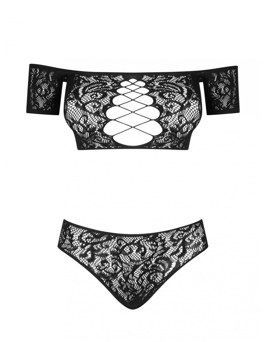 Top i majteczki tego kompletnego zestawu są wykonane z delikatnej, prześwitującej dzianiny, która podkreśla Twoje kobiece kształty. Dekolt w stylu "à la hiszpanka" subtelnie eksponuje Twoje ramiona, dodając Ci jeszcze więcej seksapilu.
