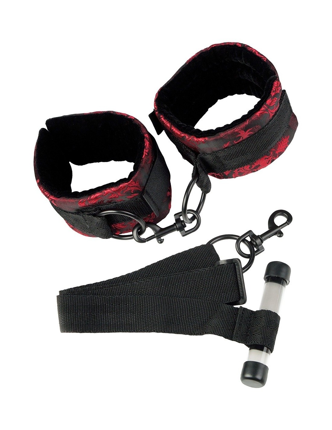 Nasze wiązania Scandal Over the Door Cuffs zachwycają swoim znakomitym projektem. Wykonane z najwyższej jakości czerwono-czarnego brokatu, dodadzą Twoim sesjom BDSM elegancji i stylu. Solidne pierścienie i klamry gwarantują niezawodność, pozwalając Ci całkowicie oddać się swoim fantazjom.