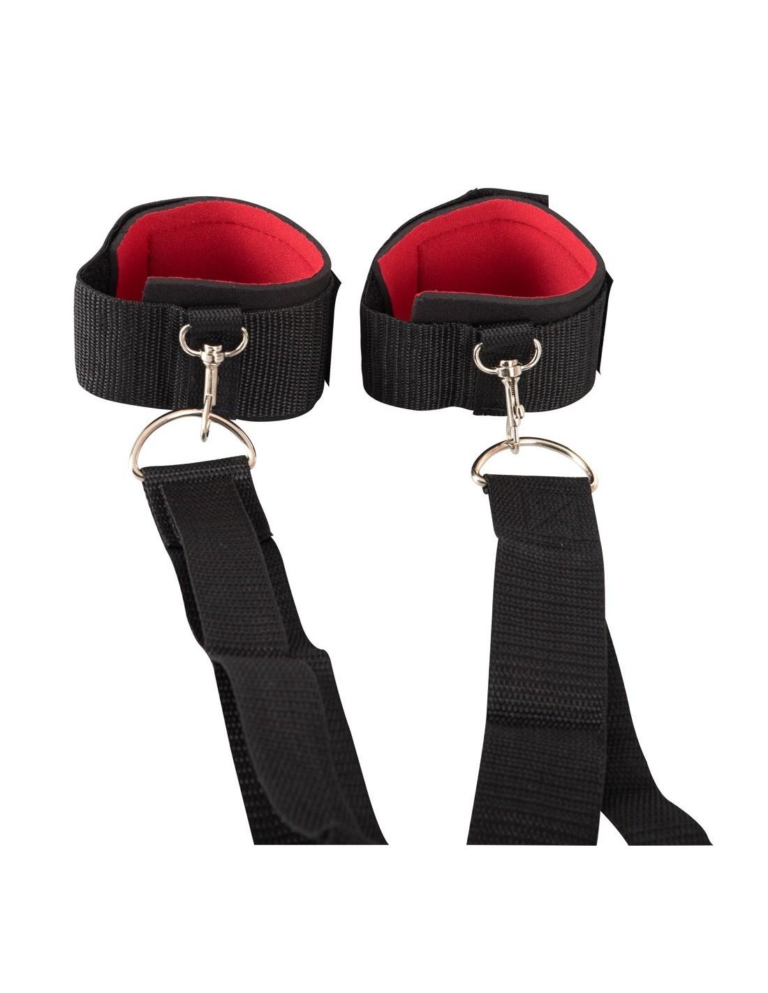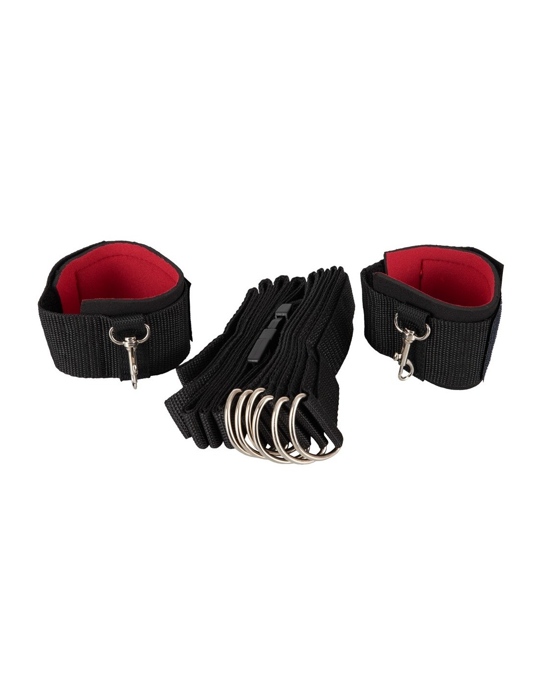 Zestaw zawiera wyściełane kajdanki, które można łatwo zaczepić do jednego lub dwóch z 6 pierścieni D-ring. Mankiety są indywidualnie regulowane za pomocą zapięcia na rzepy, dzięki czemu pasują do każdego rozmiaru. Teraz możesz cieszyć się pełną kontrolą nad swoim partnerem, bez obaw o jego wygodę.