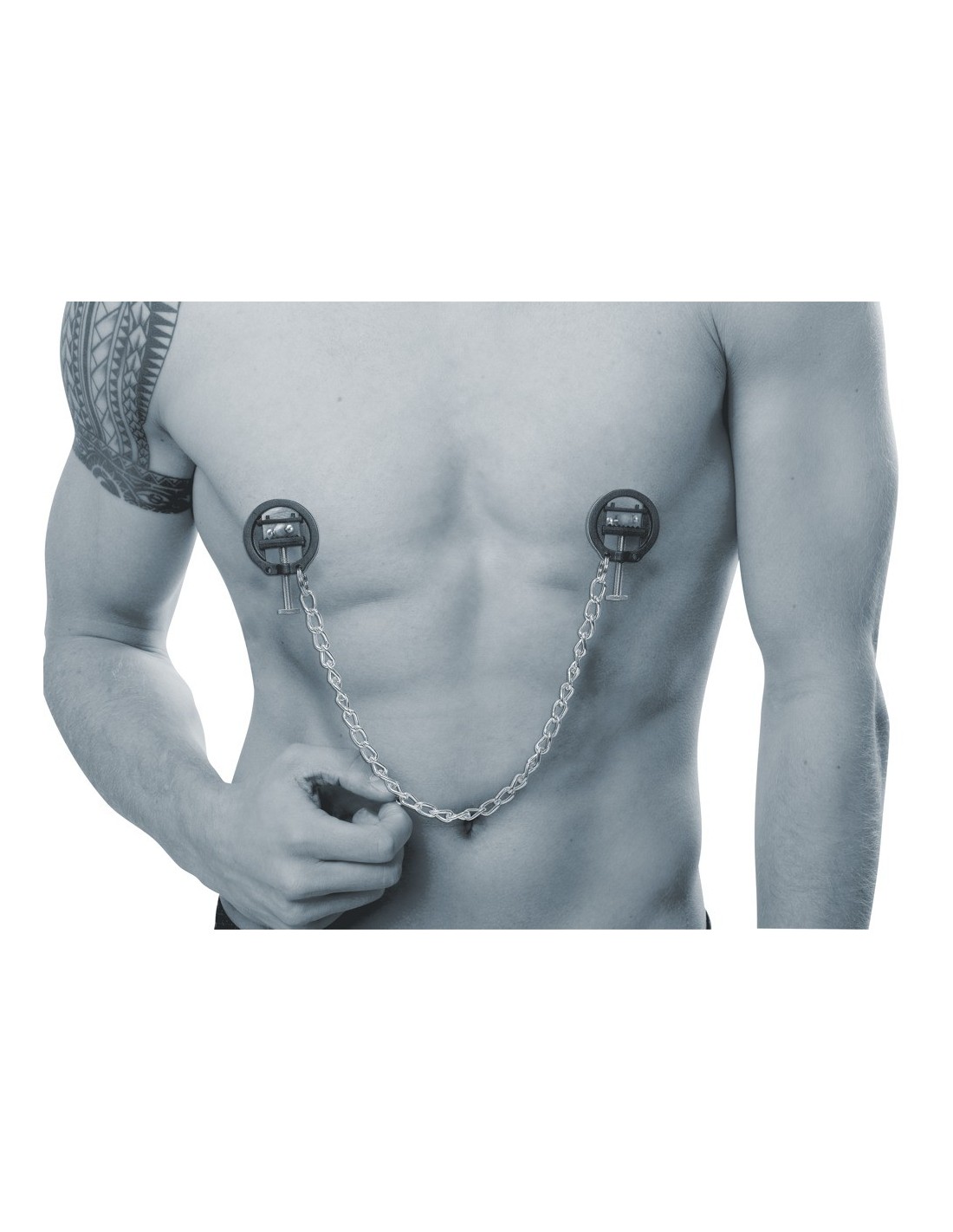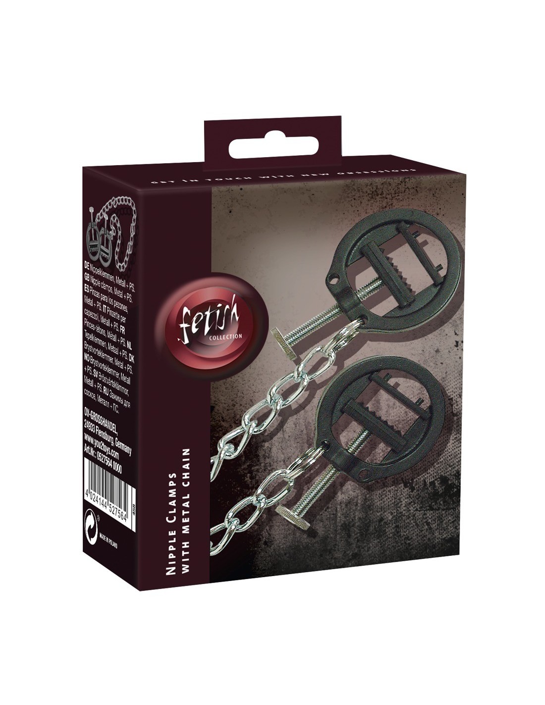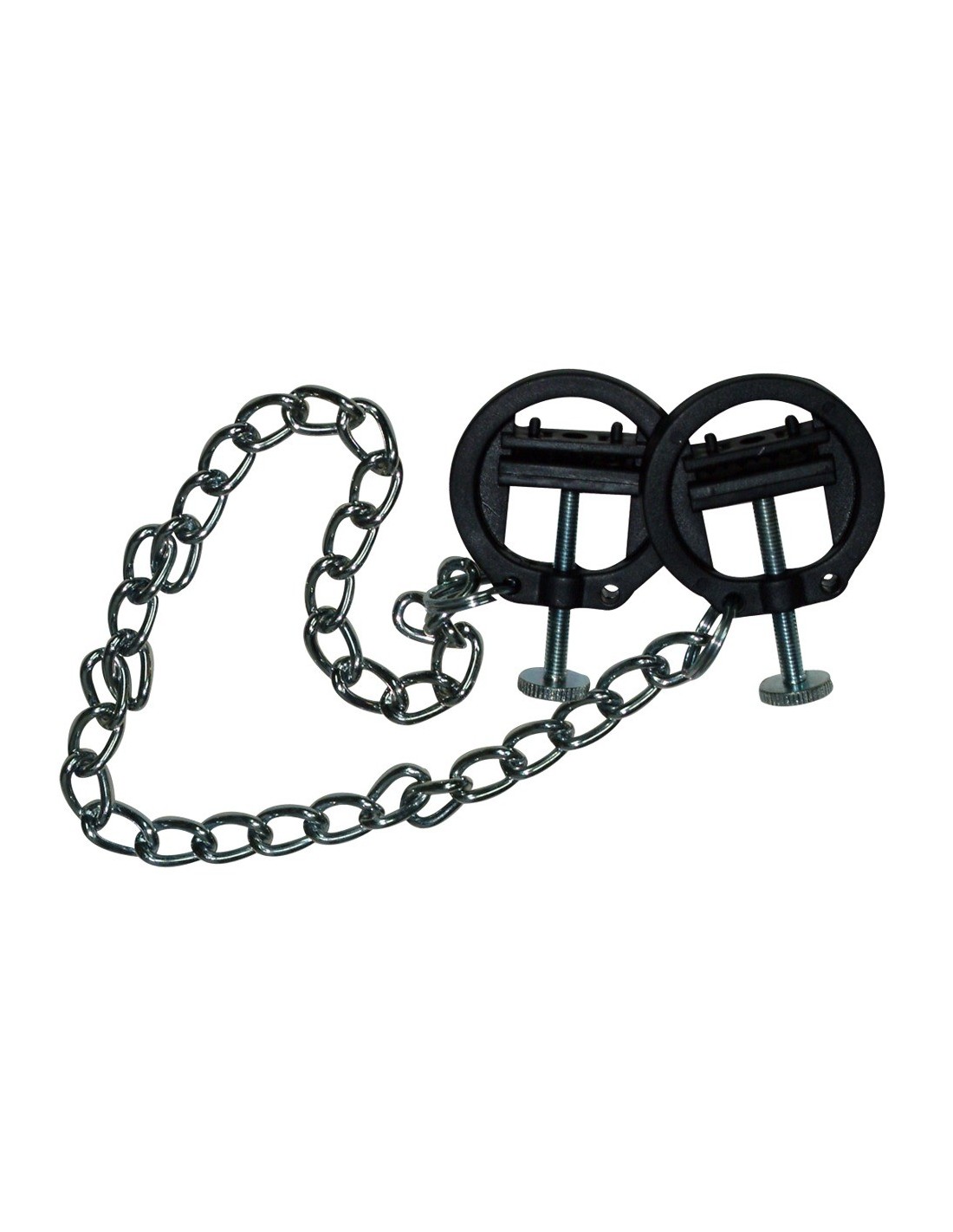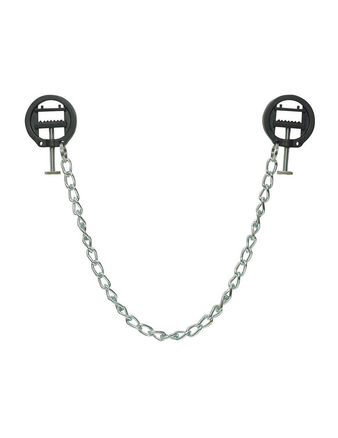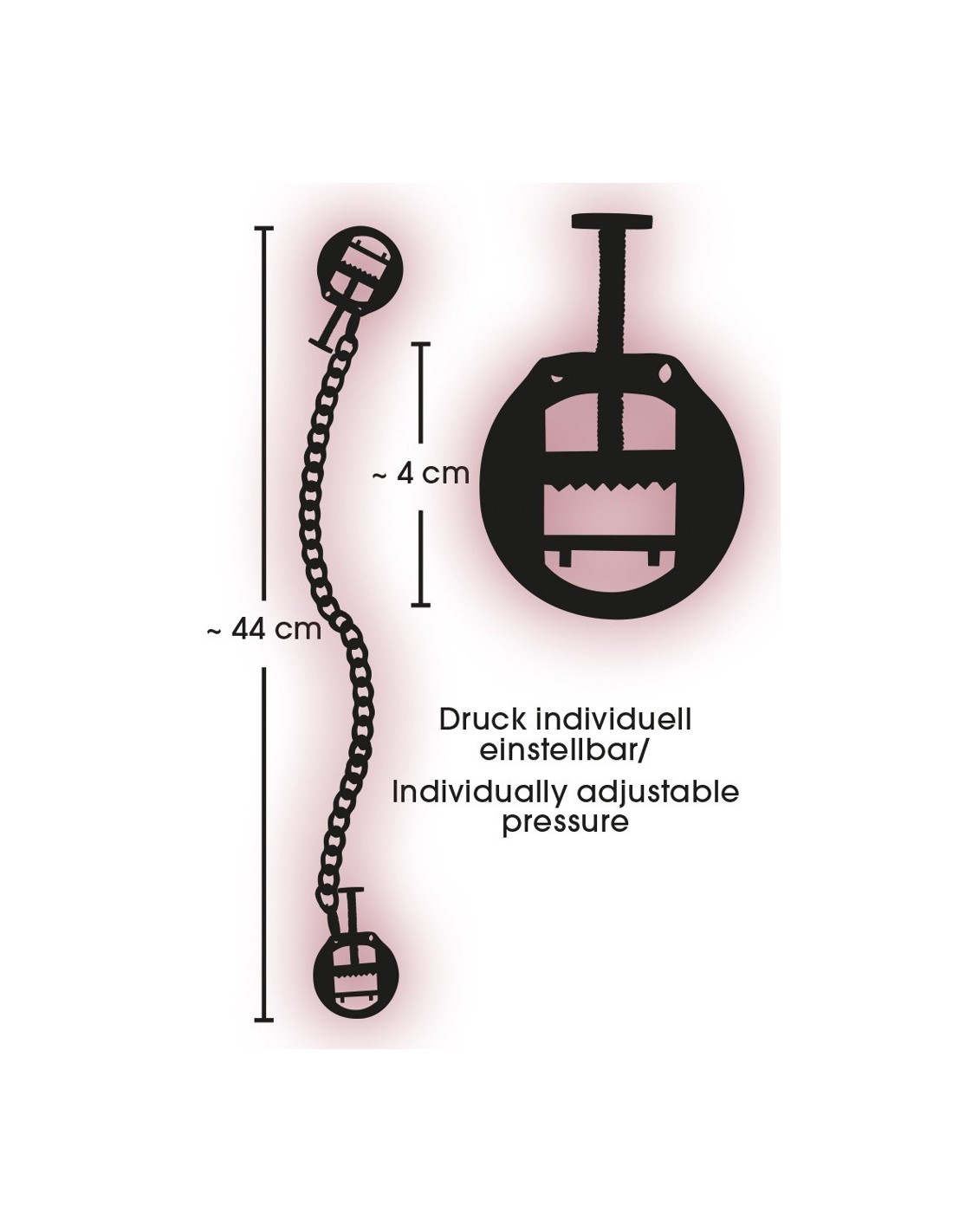 Te dwie czarne, okrągłe zaciski śrubowe są połączone lekkim jak piórko łańcuchem o długości 33 cm, który dodaje całości elegancji. Możesz indywidualnie regulować siłę docisku zacisków, aby dostosować je do swoich preferencji i odczuć.