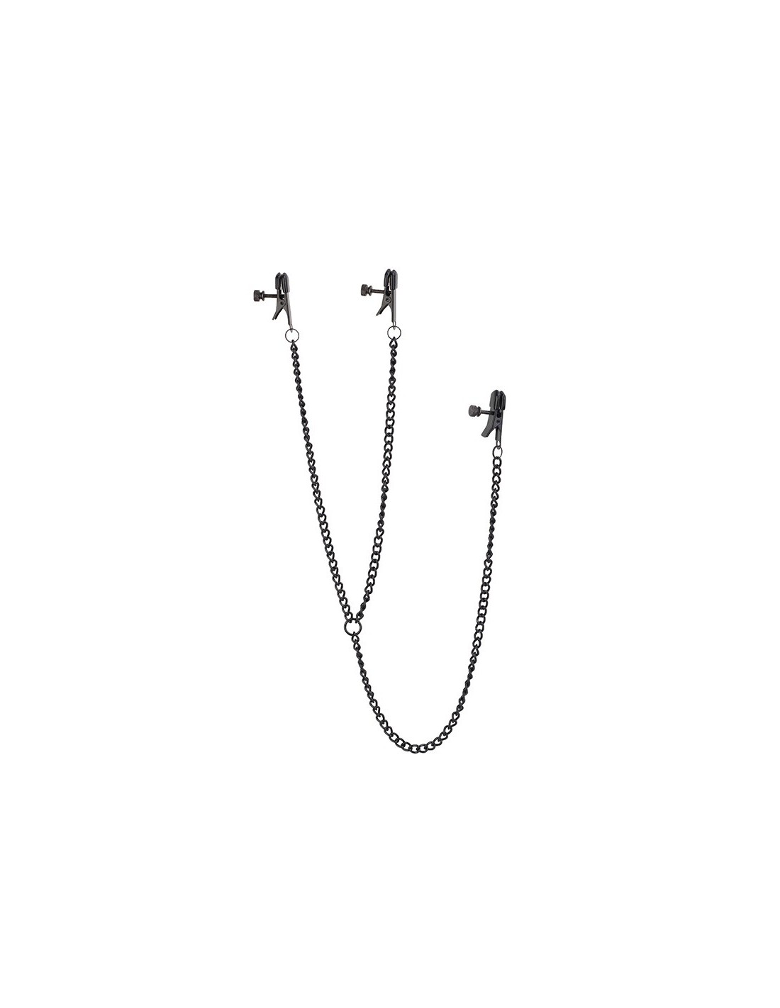 Te czarne metalowe zaciski na sutki, połączone z łańcuszkami o długości 20 cm, zapewniają niezwykłe doznania. Ich przymocowany zacisk łechtaczki na łańcuszku o długości 32 cm dodaje jeszcze więcej ekscytujących możliwości. Dzięki regulacji ciśnienia za pomocą śrub, masz pełną kontrolę nad intensywnością ściskania. Poczuj, jak podniecenie rośnie w miarę, jak delikatnie zaciski dopasowują się do Twojego ciała.