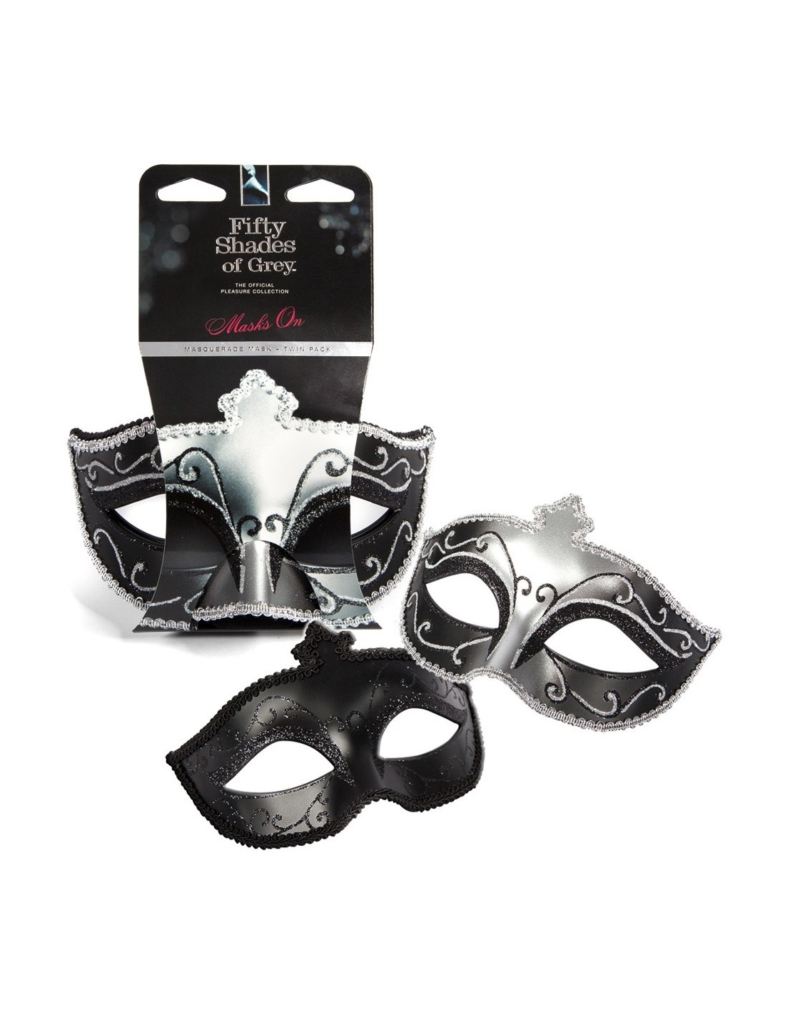 Fifty Shades of GreySet składający się z dwóch masek w stylu sycylijskim. Z satynową wstążką do zawiązać z tyłu. Czarny, srebrny, błyszczący. Materiał: twarde tworzywo sztuczne, satyna.
