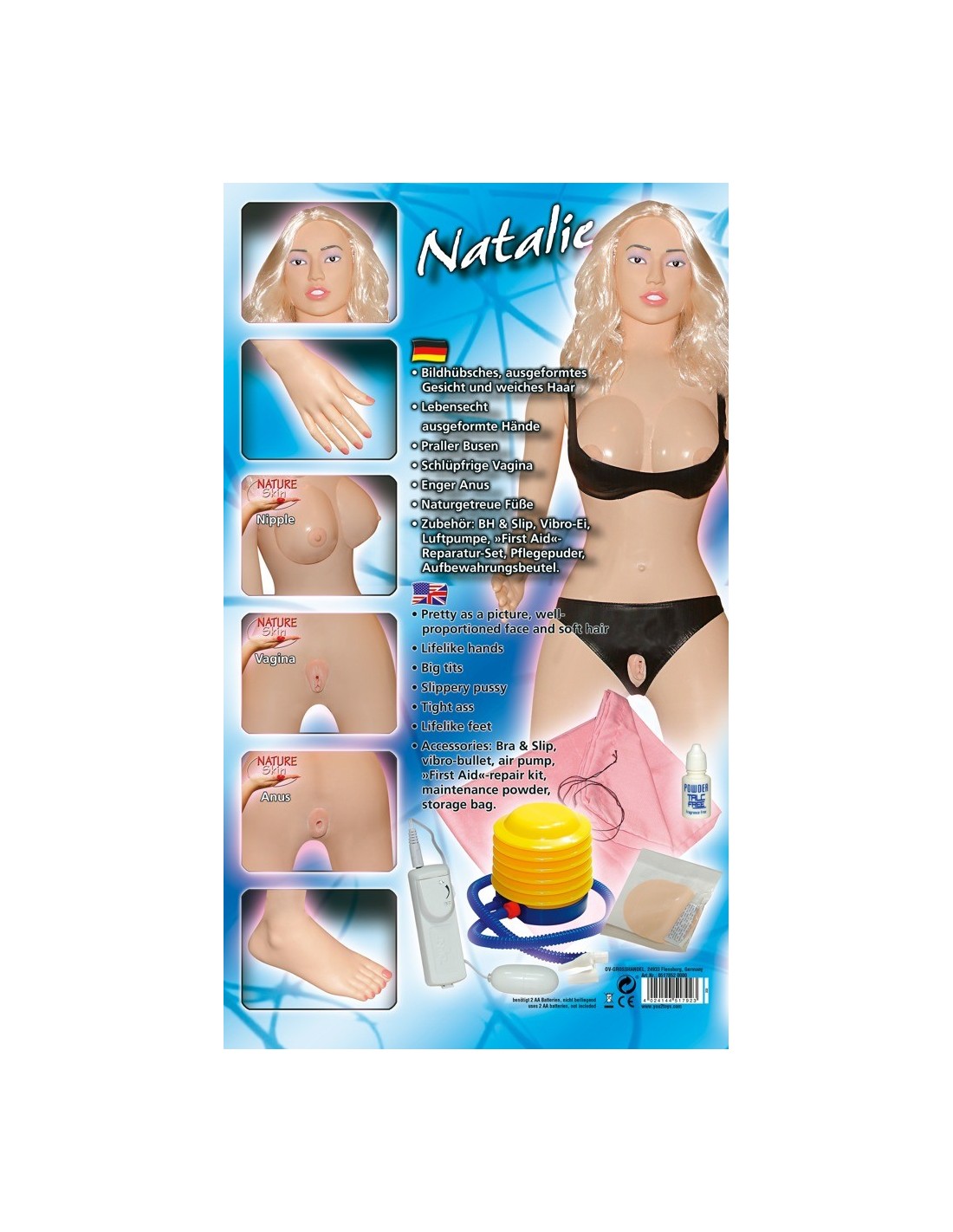 W zestawie z Natalie otrzymasz także wiele ekscytujących akcesoriów, takich jak biustonosz, majtki i wibrująca kula o wielu prędkościach, która sprawi, że doznania z jej dwóch miękkich kanałów przyjemności będą jeszcze bardziej ekscytujące. Dodatkowo, w zestawie znajduje się pompa nożna, zestaw naprawczy, praktyczna torba do przechowywania oraz talk w proszku, abyś zawsze mógł dbać o swoją lalkę w najlepszy sposób.
