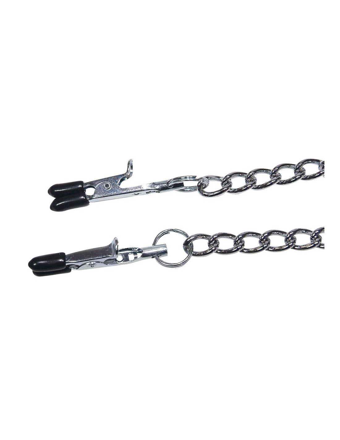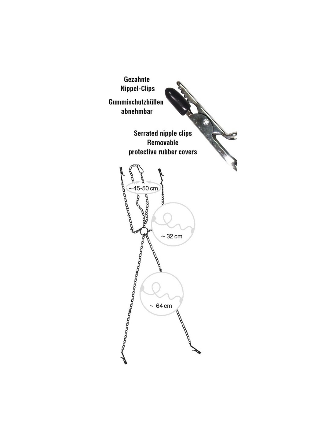 Dzięki łańcuchom z zaciskami sutków o całkowitej długości 30 cm każda, Zaciski na sutki Harness With Clamps zapewniają intensywną stymulację i kontrolowane podniecenie. Te klipsy na sutki są idealnie dopasowane, aby delikatnie ściskać sutki, jednocześnie zapewniając przyjemne uczucie napięcia. Możesz regulować nacisk, aby dostosować do swoich preferencji i stopnia komfortu.