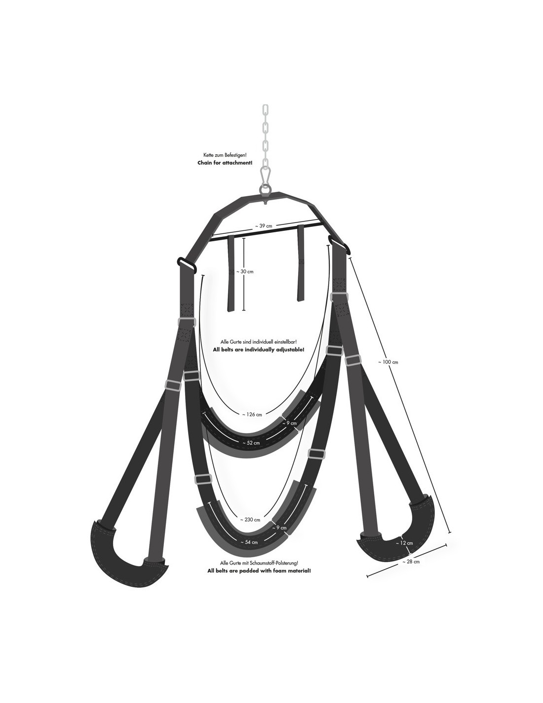 Za pomocą solidnej konstrukcji nośnej i montażowej, Huśtawka do seksu Bad Kitty Swing zapewnia Ci niezrównaną swobodę ruchów i pełną kontrolę nad swoją intymnością. Możesz delikatnie kołysać się w powietrzu, czując jakbyś leciał na skrzydłach rozkoszy, lub usiąść na huśtawce, dając partnerowi pełną kontrolę nad Twoimi ruchami. Dzięki regulowanym paskom i pętlom na dłonie i stopy, możesz dostosować huśtawkę do swoich preferencji i cieszyć się nieograniczoną przyjemnością.