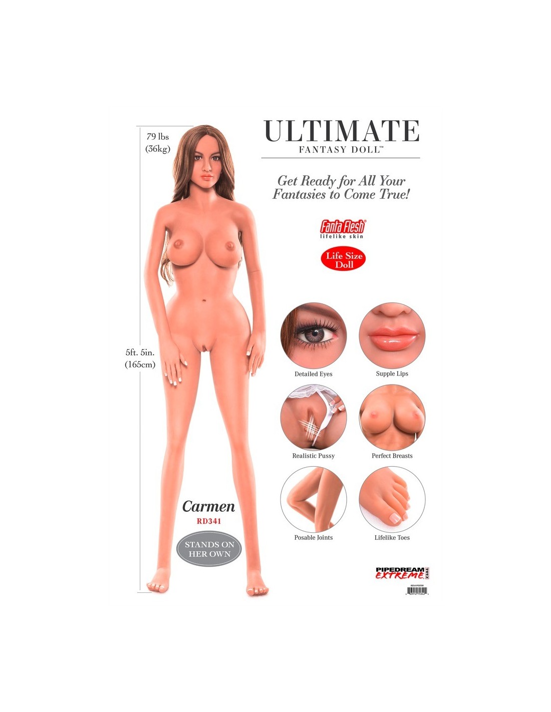 Carmen zachwyca swoją niezwykłą urodą i autentycznymi detalami. Jej piękna twarz 3D z głębokimi brązowymi oczami, długimi rzęsami i soczystymi ustami sprawiają, że wygląda jak prawdziwa kobieta. Jej skóra wykonana z wysokiej jakości materiału TPE jest niesamowicie realistyczna, a zmysłowe wargi sromowe dodają jeszcze więcej pikanterii.