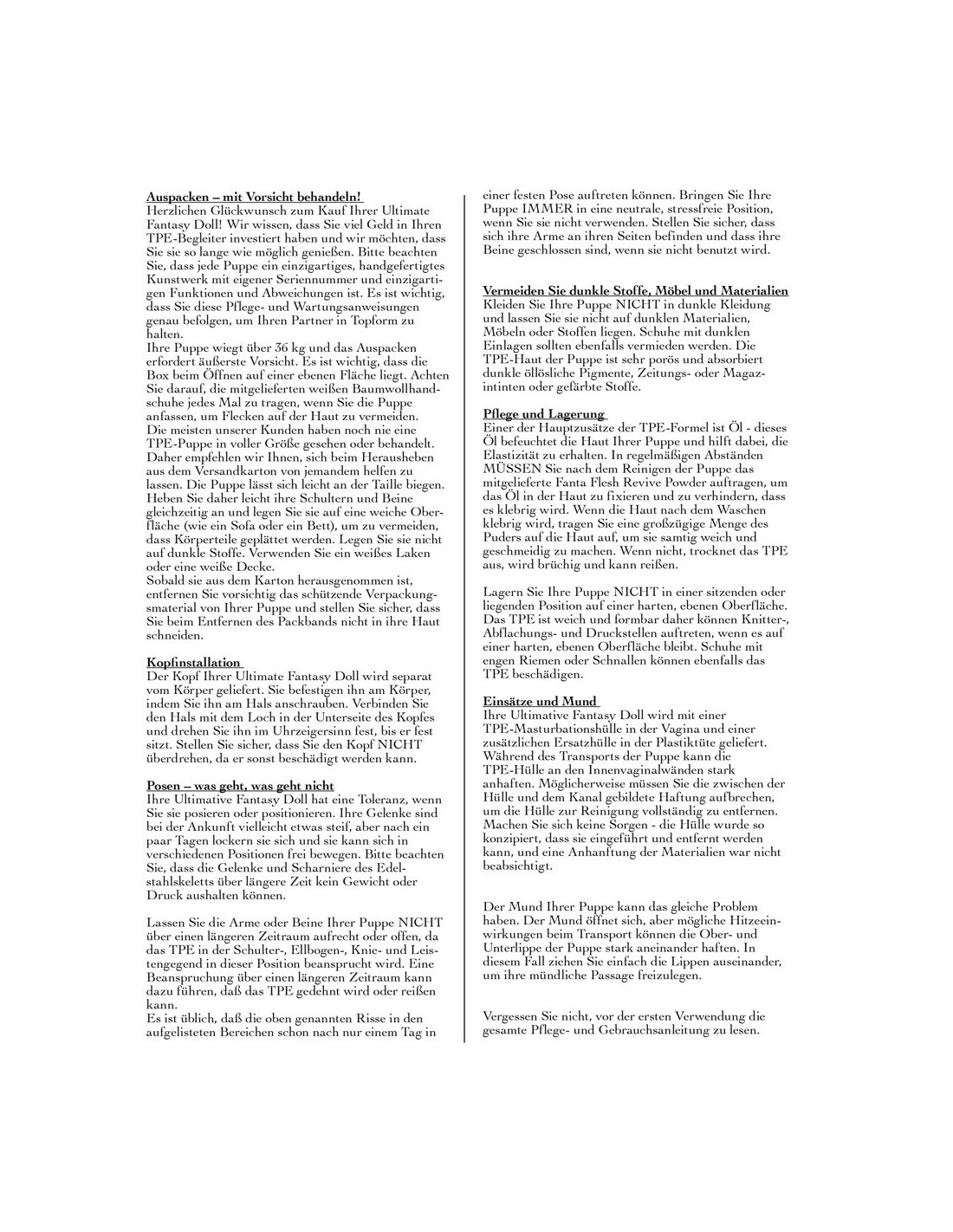 Jej smukła sylwetka z szerokimi biodrami i zmysłowymi piersiami z idealnie ukształtowanymi sutkami przyciąga wzrok i zapewnia niezapomniane doznania. Ruchome dłonie i stopy z wypielęgnowanymi paznokciami dają możliwość jeszcze większej interakcji z lalką, a szkielet ze stali nierdzewnej zapewnia stabilność i możliwość postawienia jej samodzielnie.