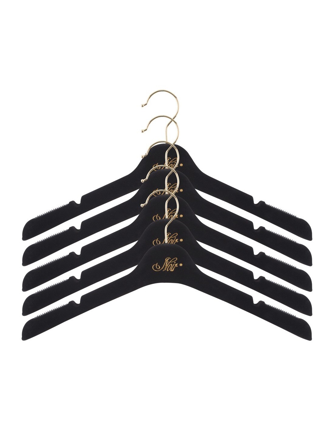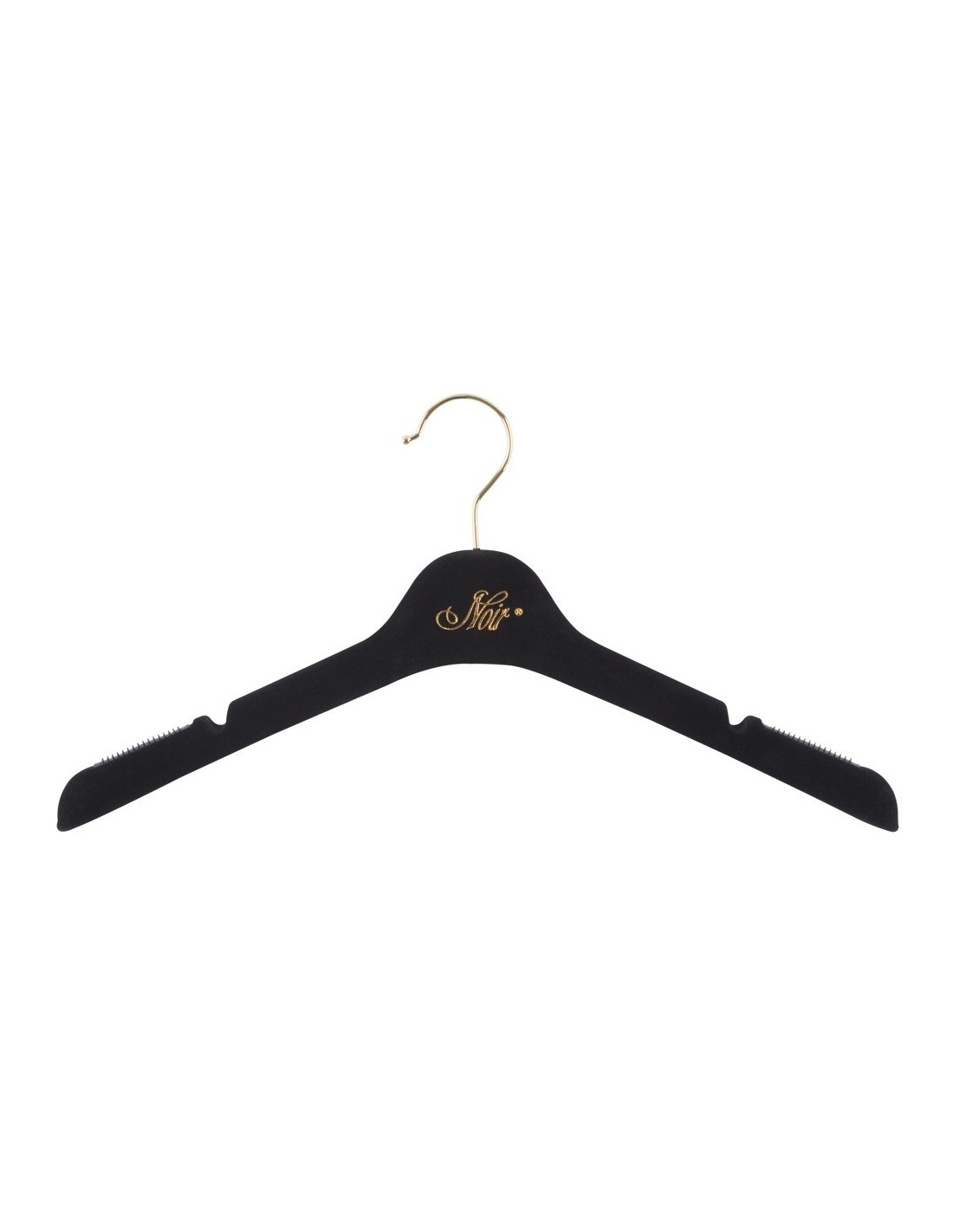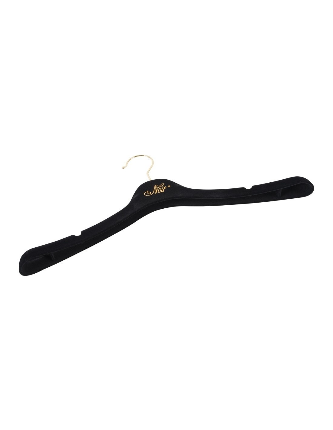 Pokryte na ubrania wieszaki na ubrania ze złotym tekstem NOIR i haczykiem.