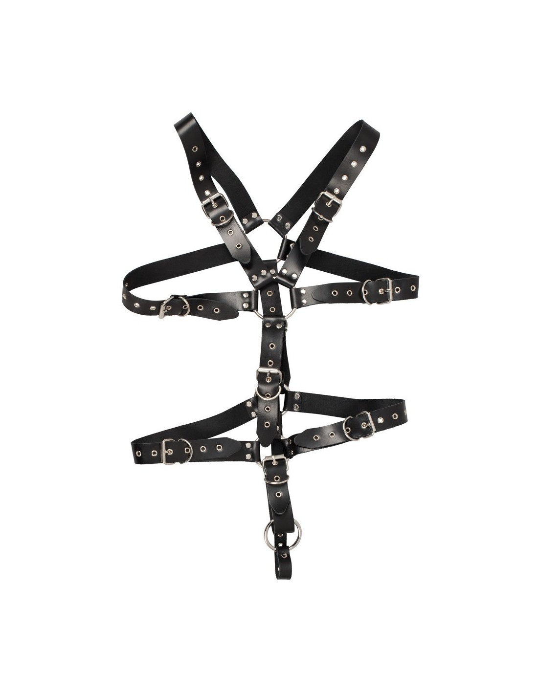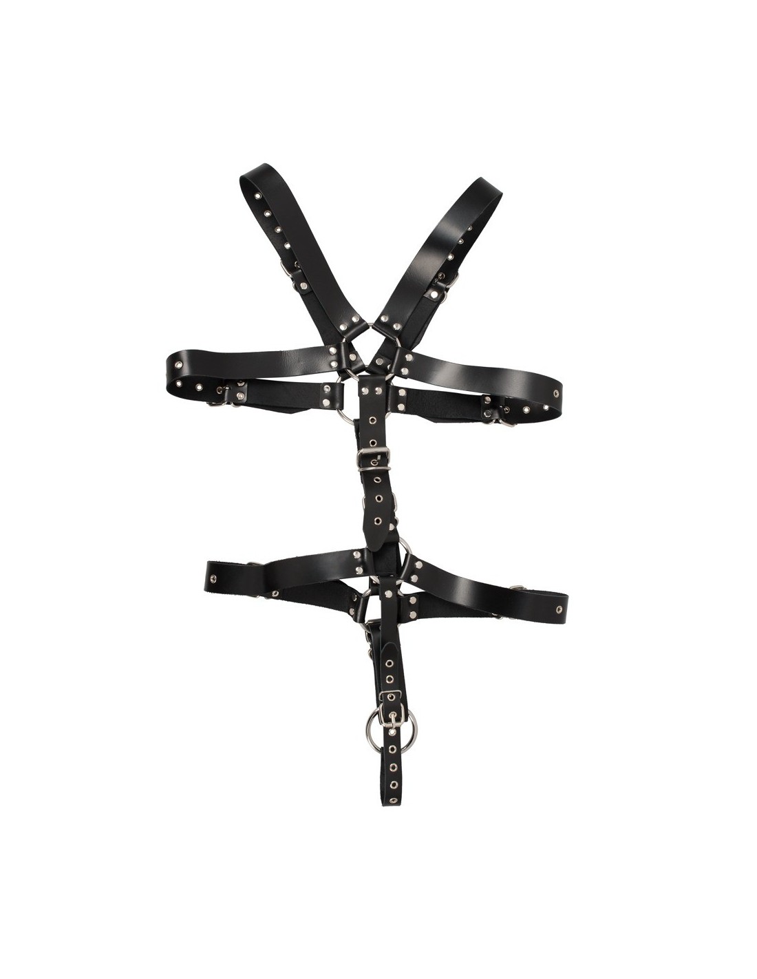 Ta skórzana uprząż została wykonana z czarnych skórzanych pasków i stalowych pierścieni, które łączą się w zmysłowy i intrygujący wzór. Dzięki wielu regulowanym zapięciom na klamry, możesz indywidualnie dostosować uprząż do swojego ciała, zapewniając maksymalny komfort i kontrolę podczas każdej sesji. Dodatkowo, pierścień jąder o średnicy 5 cm utrzymuje go w odpowiednim miejscu, zapewniając niezapomniane doznania.