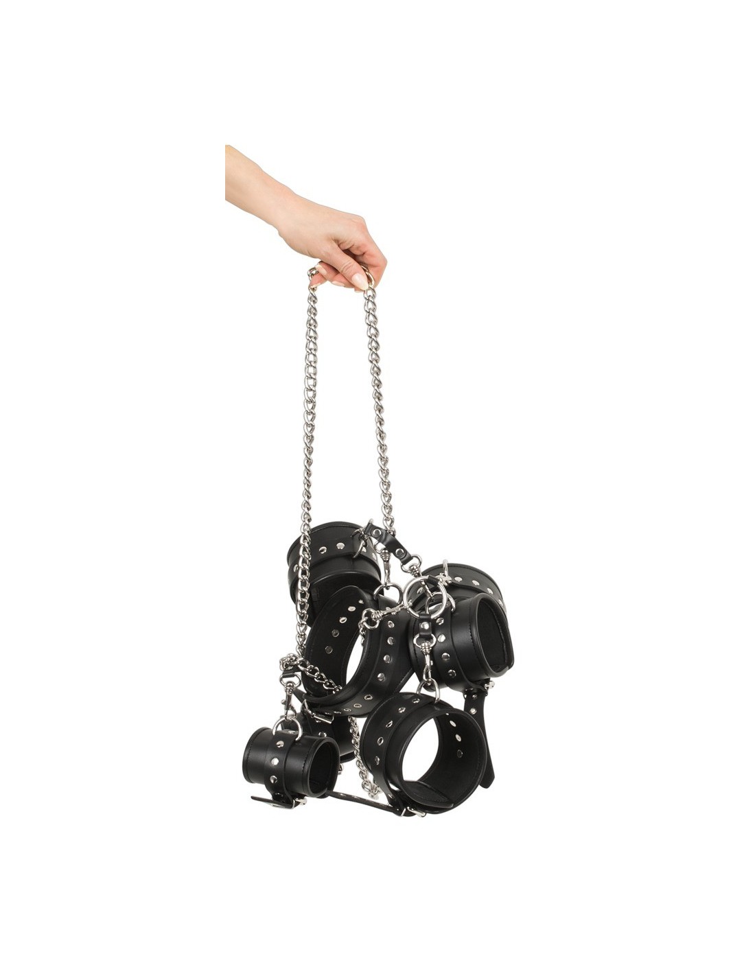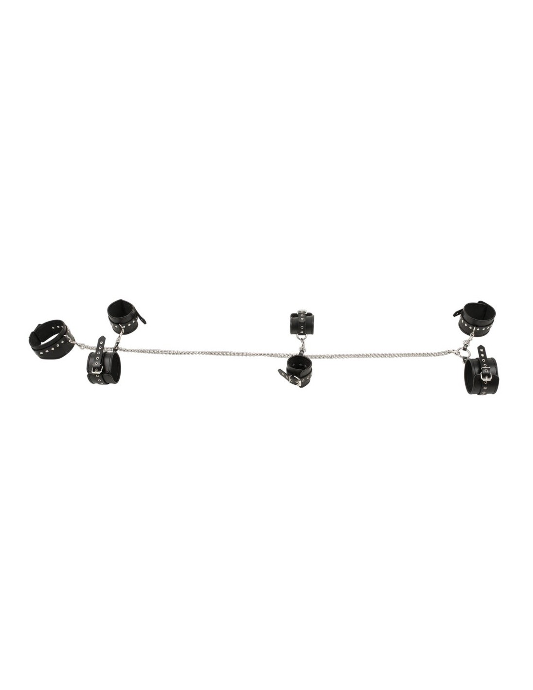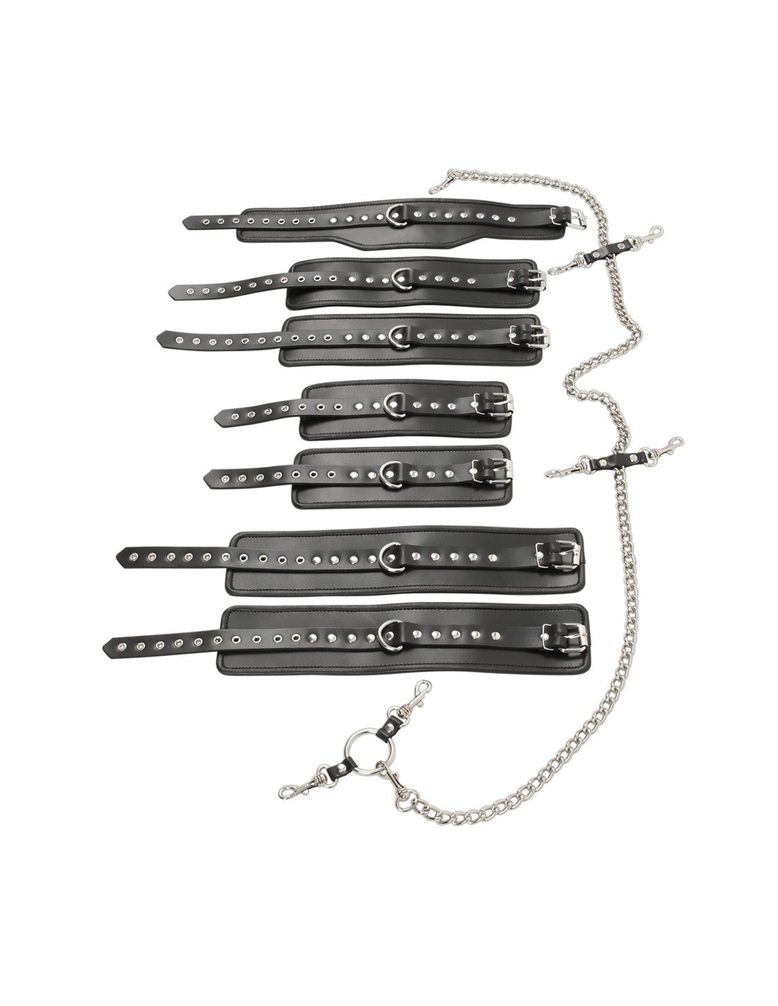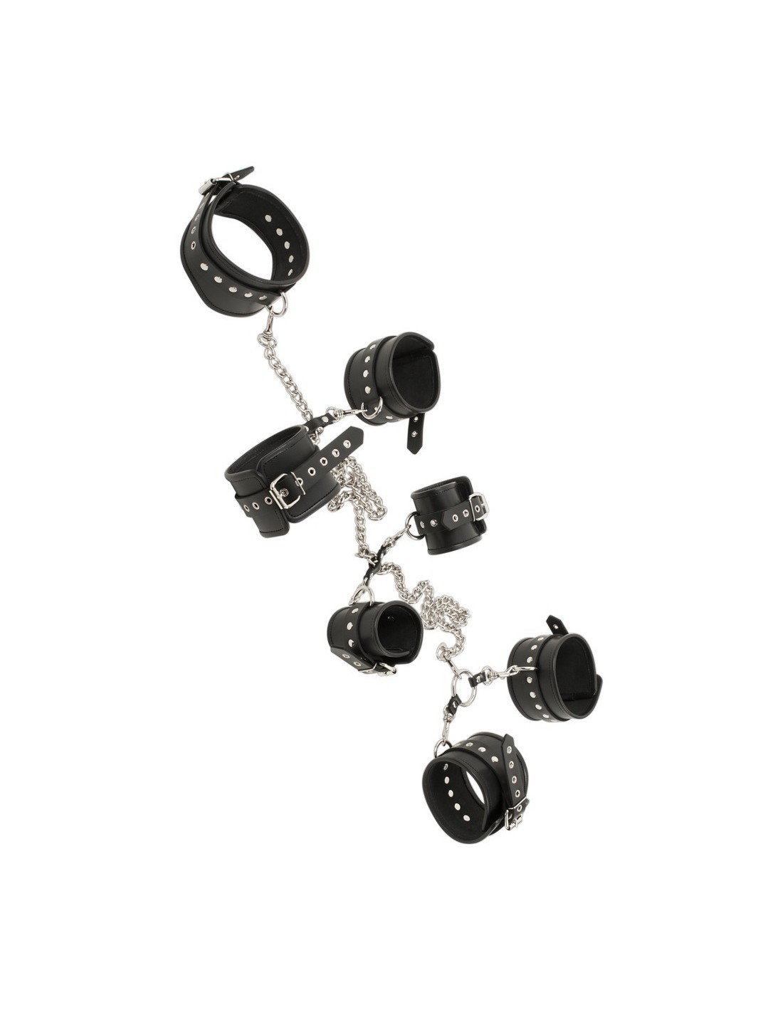 Zestaw zawiera wszystko, czego potrzebujesz, aby rozpocząć swoją przygodę. Kołnierz, para mankietów na nadgarstki, para mankietów na kostki i para mankietów na ramiona - to wszystko czeka na Ciebie. Każda para mankietów jest połączona z metalowym łańcuchem, który spływa z kołnierza, dając Ci nieograniczoną swobodę ruchu i możliwość eksploracji.