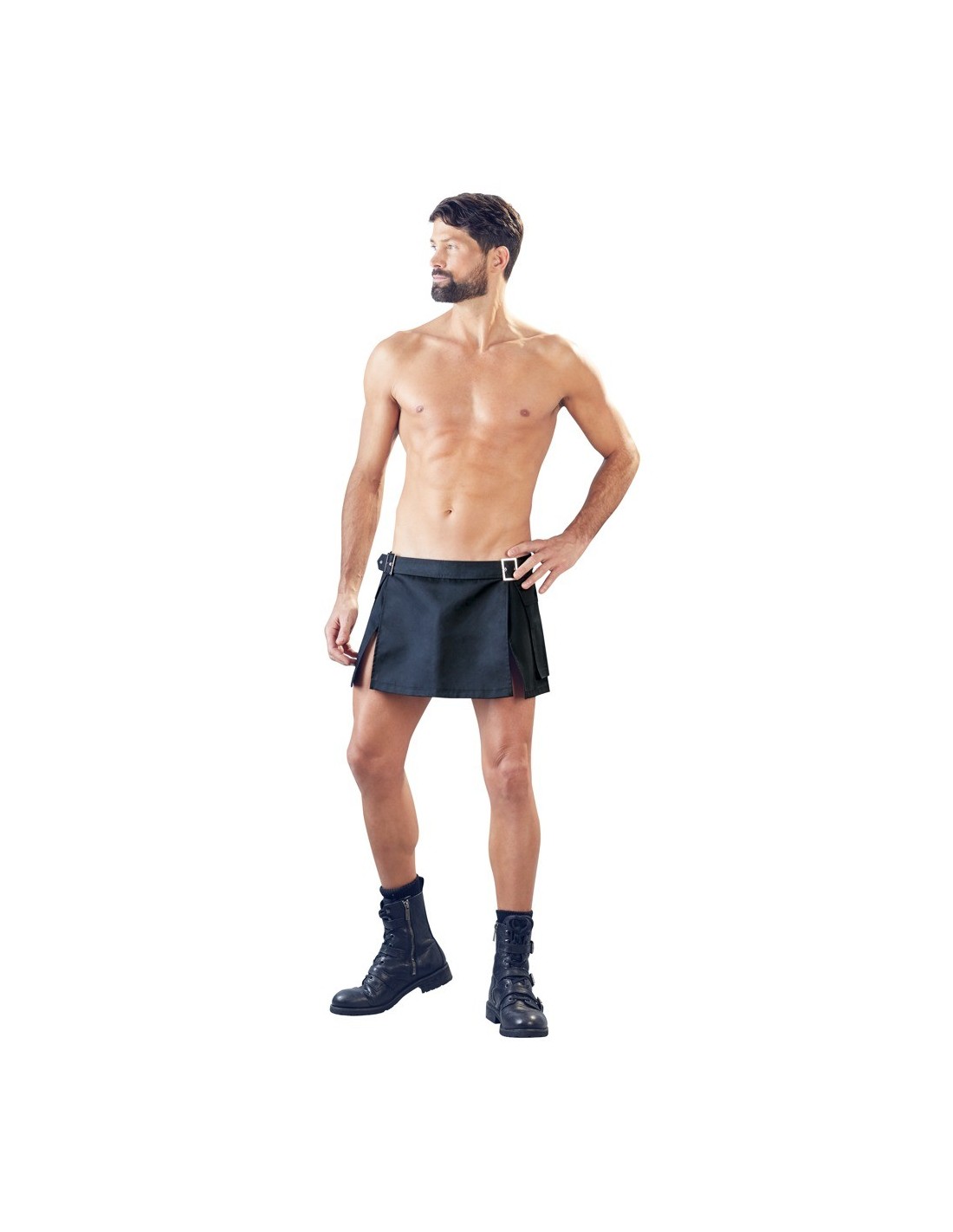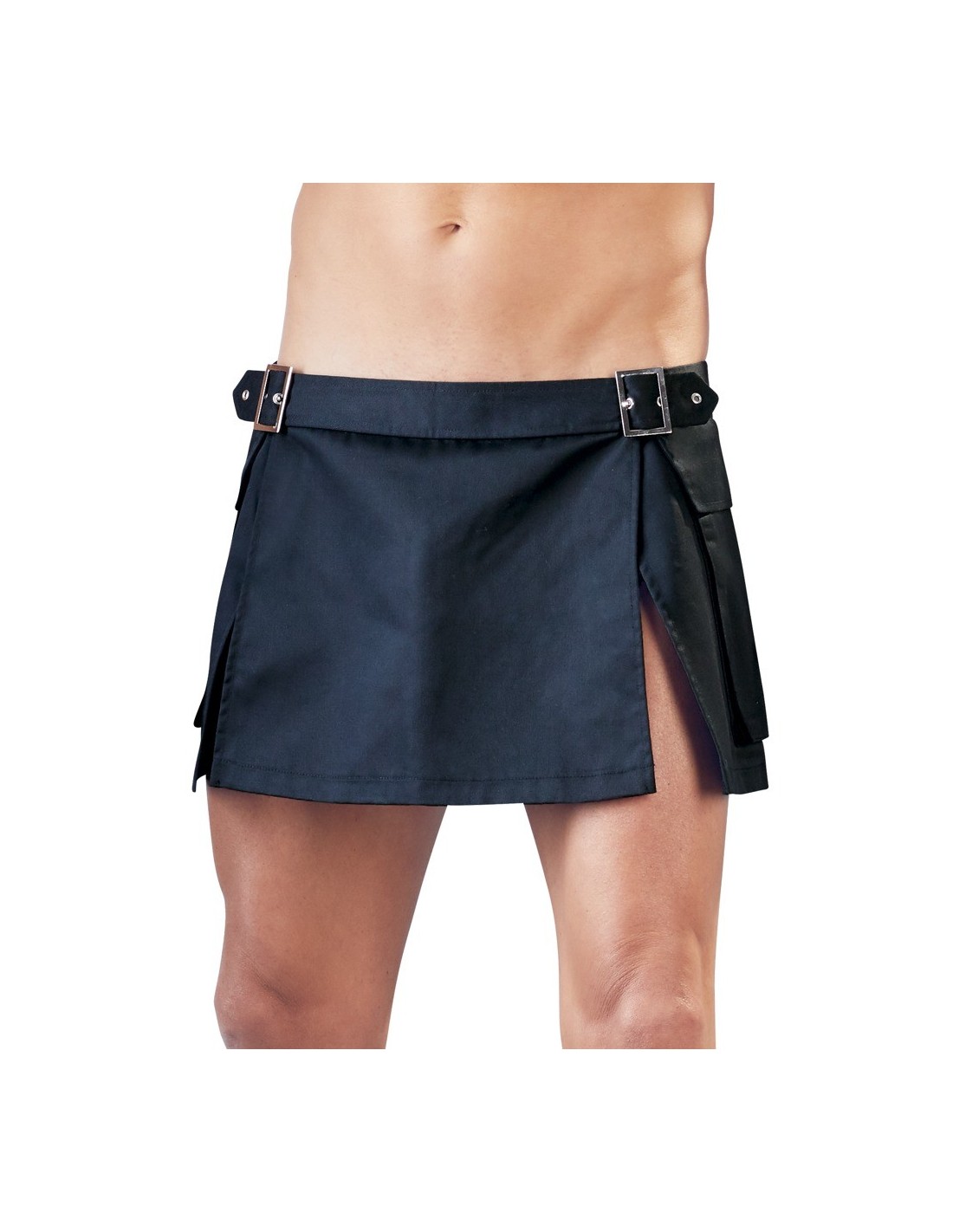 Krótka spódnica męska w stylu gladiatora wykonana z twardego materiału tkanego. Z ozdobnymi klamrami i dużymi kieszeniami po bokach.