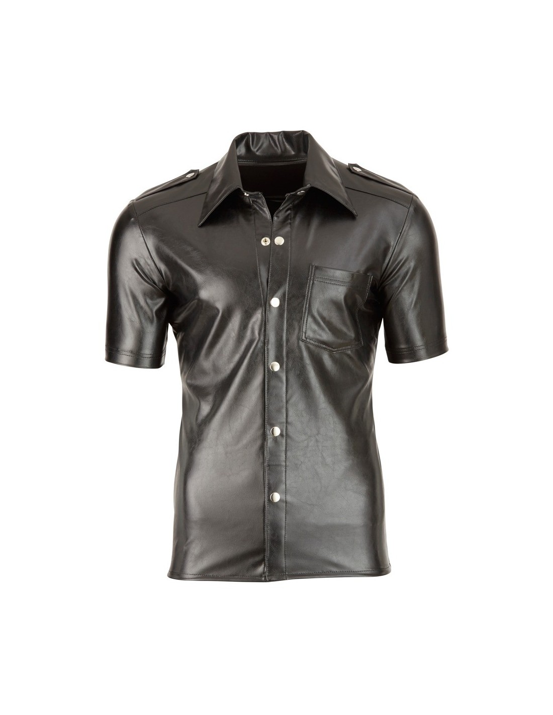 Koszula wykonana jest z wysokiej jakości błyszczącej czarnej imitacji skóry. Materiał ten nie tylko wygląda niesamowicie, ale także jest niezwykle wygodny w noszeniu. Lekko dopasowany krój podkreśla mięśnie i nadaje sylwetce atrakcyjny wygląd. Dodatkowo, dzięki elastycznemu materiałowi z dodatkiem spandexu, koszula idealnie dopasowuje się do ciała, zapewniając pełną swobodę ruchów.