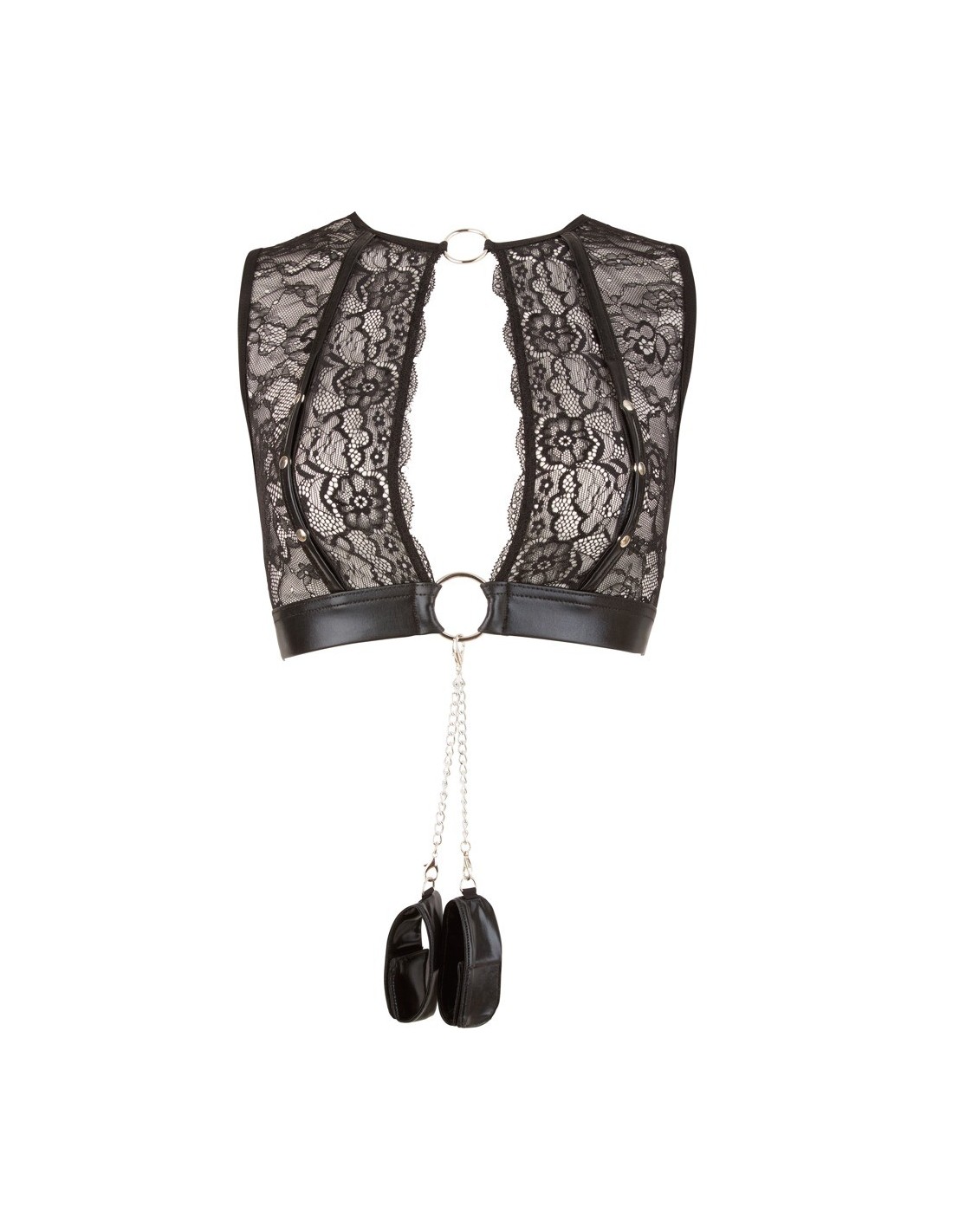 W zestawie znajdują się również kajdanki z zapięciami na rzepy, które można przymocować do ozdobnych pierścieni na górze lub paska szelki. To oznacza, że ten komplet bielizny można szybko przekształcić w specjalny zestaw bondage dla początkujących. Pozwól sobie na odrobinę dominacji i poddaj się przyjemności eksploracji nowych obszarów swojej intymności.