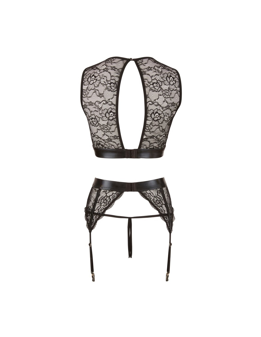 Ten komplet bielizny został wykonany z wysokiej jakości materiałów, takich jak przezroczysta koronka i czarny mokry wygląd. Połączenie tych dwóch elementów nadaje mu niezwykłego uroku i sprawia, że każdy detal wygląda jeszcze bardziej kusząco. Dodatkowo, zatrzaski na piersiach umożliwiają łatwe rozpięcie, co daje możliwość szybkiego uwolnienia swoich fantazji.