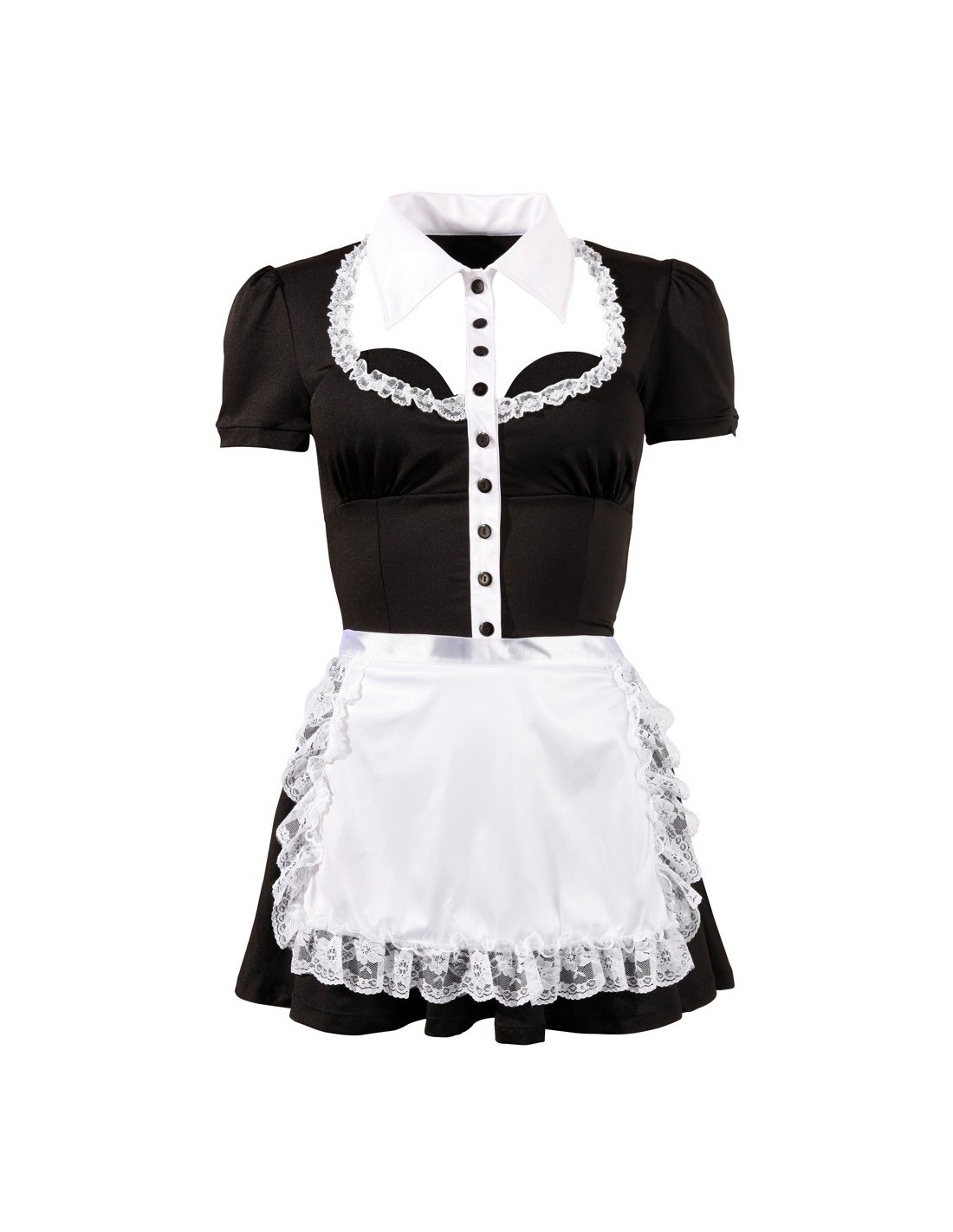 Ta słodka sukienka to połączenie klasyki i uwodzenia. Jej rzędy guzików i ozdobne marszczenia w obszarze dekoltu dodają jej niepowtarzalnego uroku. Biały fartuch, który wiąże się z tyłu, nadaje całości jeszcze większej atrakcyjności. Wykonana z wysokiej jakości materiałów, sukienka składa się z 90% poliestru i 10% spandexu, zapewniając idealne dopasowanie i wygodę. Fartuch wykonany jest z 100% poliestru, co dodaje mu delikatności i lekkości.