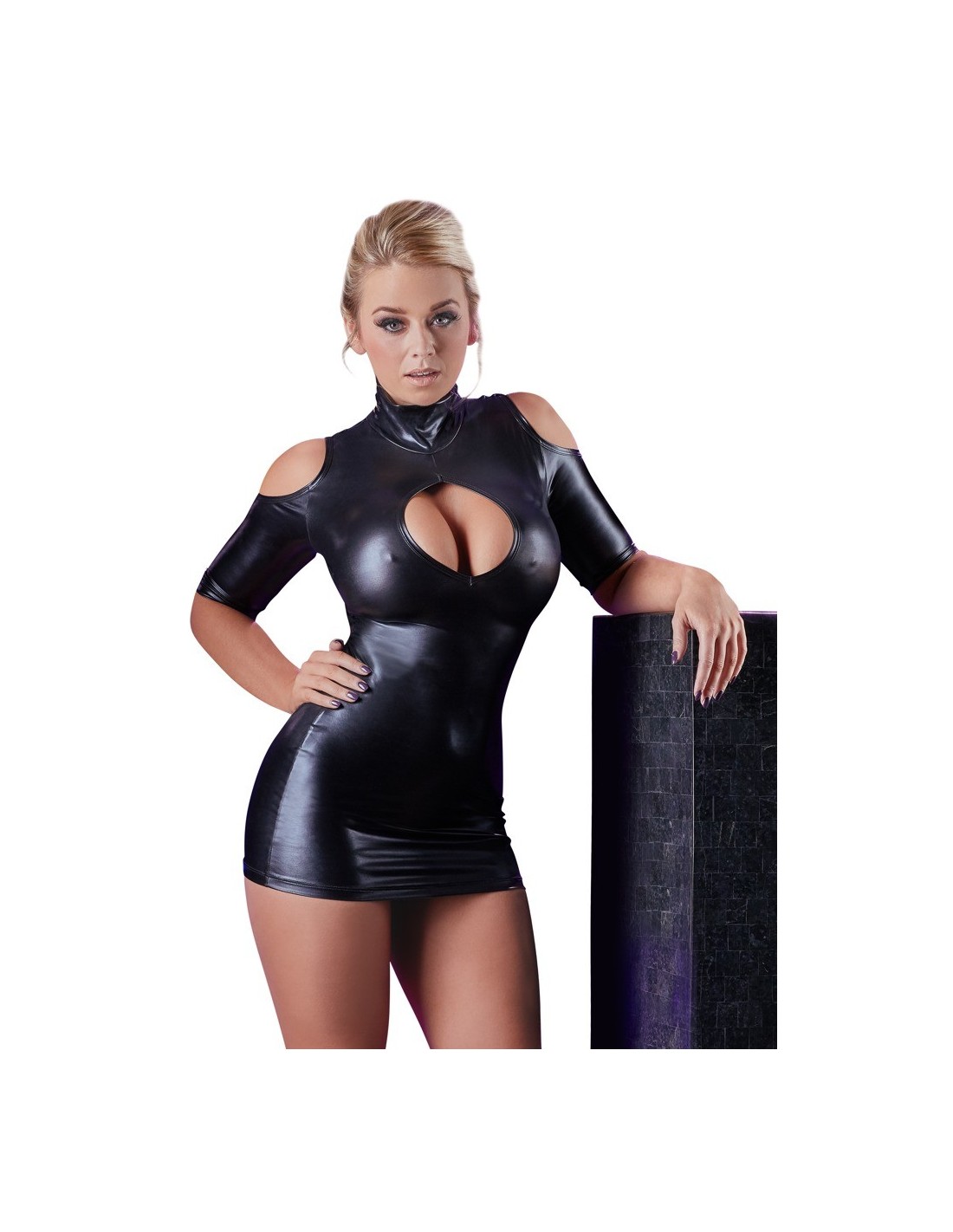 Wykonana z błyszczącego matowego materiału o mokrym wyglądzie, sukienka przylega do Twojego ciała, podkreślając piękne krągłości w uwodzicielski sposób. Dzięki stójce i półrękawom, sukienka nadaje się zarówno na romantyczną kolację, jak i na gorącą noc pełną namiętności. Niezwykłe wycięcia w postaci szelkowych pasków dodają sukience ekstra pikanterii, sprawiając, że będziesz wyglądać niezwykle kusząco i zmysłowo.