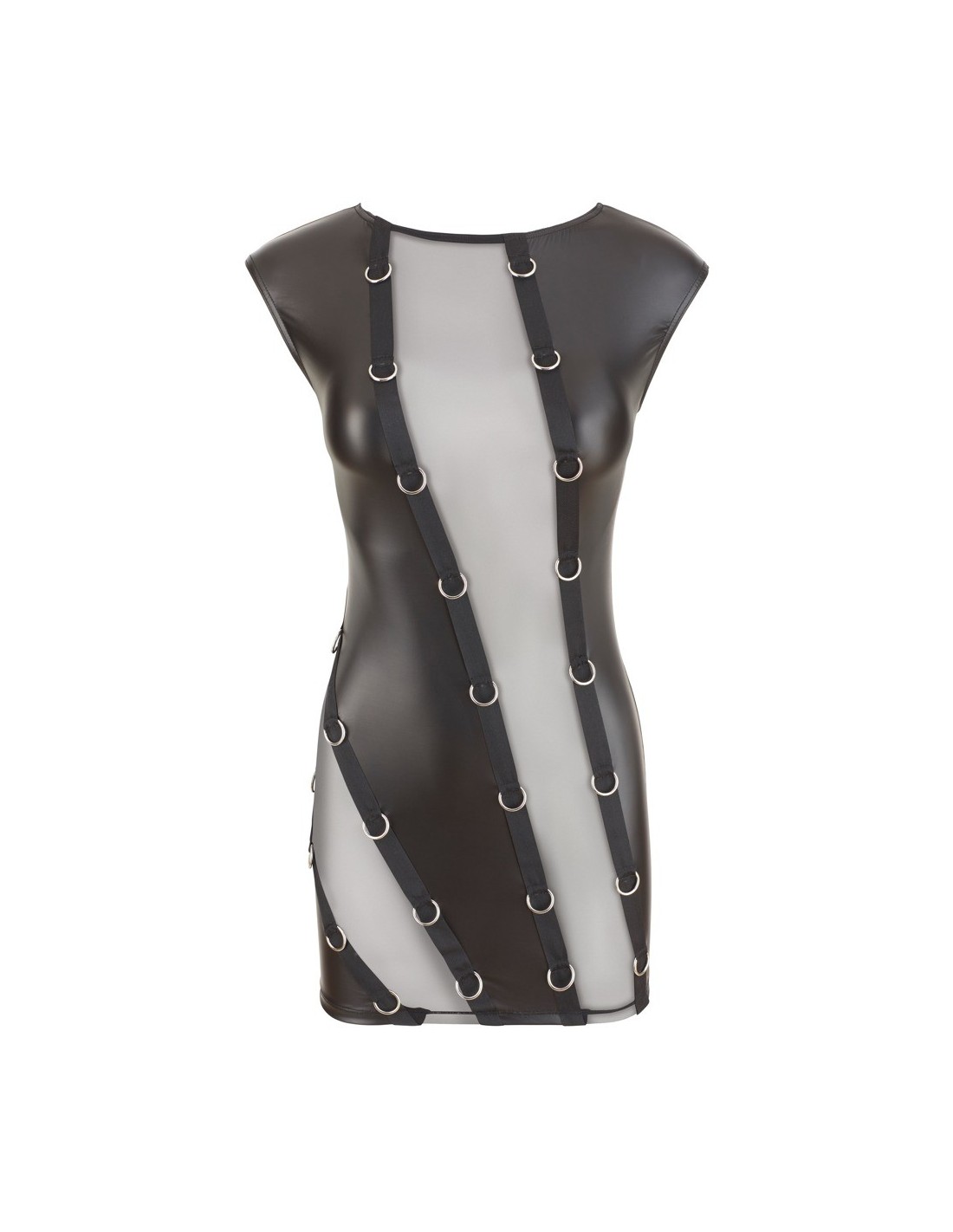 Ta mini sukienka bez rękawów wykonana jest z czarnego, mokrego materiału, który dodaje Ci niezwykłego seksapilu. Jej fantazyjny design z przodu z pewnością przyciągnie uwagę Twojego partnera. Przezroczyste wkładki powernet zapewniają gorący i bezczelny widok, jednocześnie ukrywając Twoje najbardziej ekscytujące części ciała. Matowy materiał skutecznie maskuje sutki i okolice intymne, pozostawiając miejsce na wyobraźnię Twojego partnera.