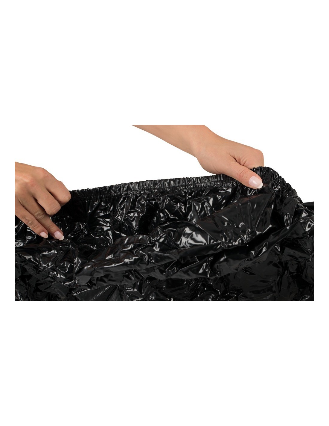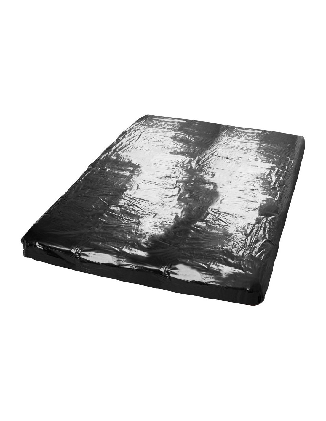 Czarny, błyszczący winyl, wszystkie boki z frędzlami z rozciągnięciem dla pewnego chwytu na materacu! Wymiary: 160 x 200 cm. Wycierać, nie prać w pralce. Materiał: polichlorek (winyl).