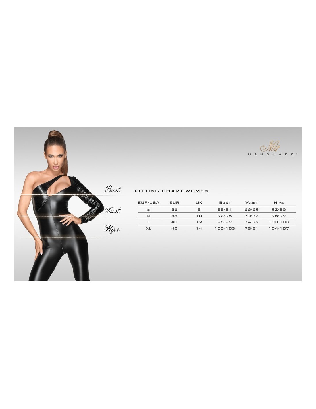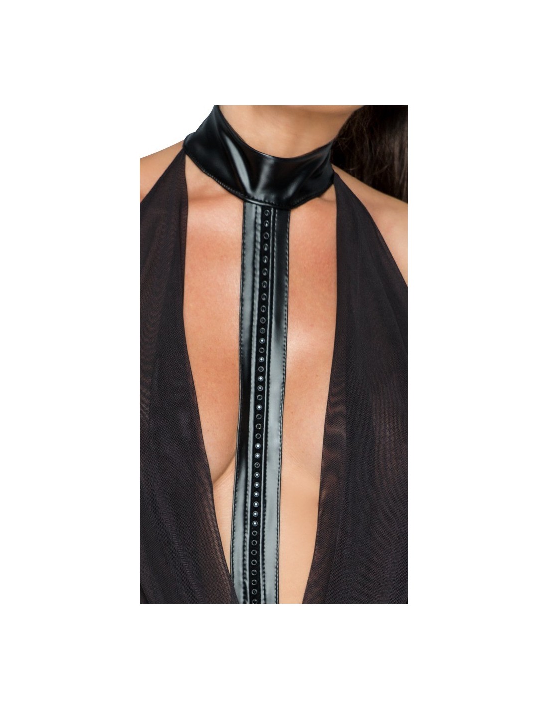Dotrzyma sukienka wykonana z błyszczącego matowego mokrego wyglądu. Sukienka ma kołyszącą się górną część powernet. Przedni pasek jest ozdobiony błyszczącymi kamieniami i prowadzi do kołnierza za pomocą zapięcia na haczyk. Jest całkowicie bez pleców dla niesamowitych widoków - tylko pośladki są pokryte częścią spódnicy.