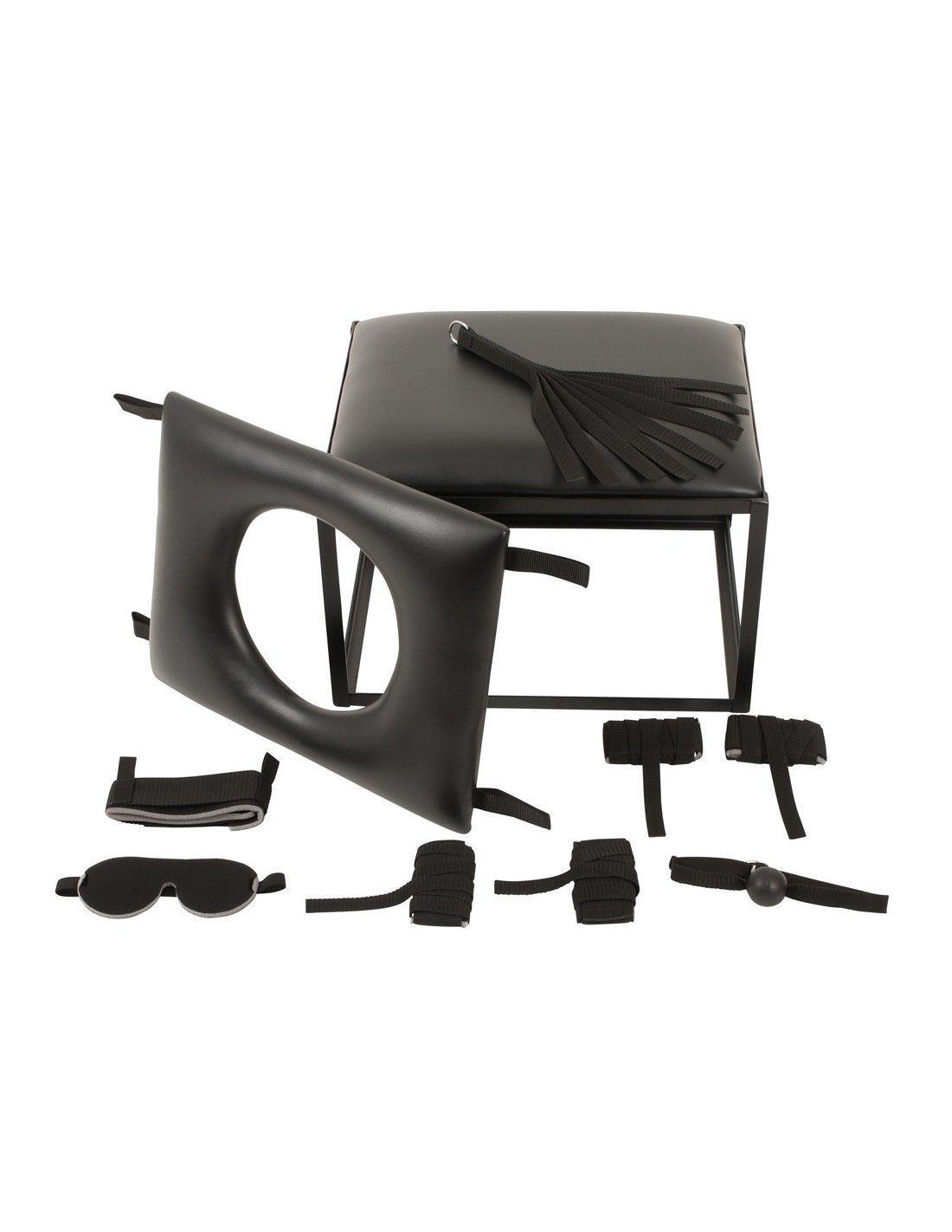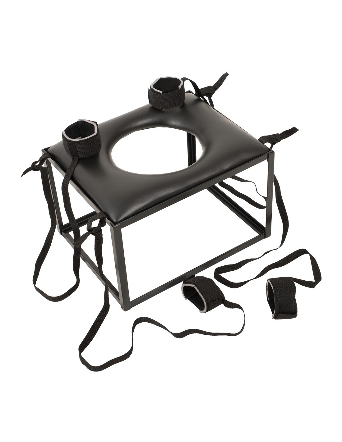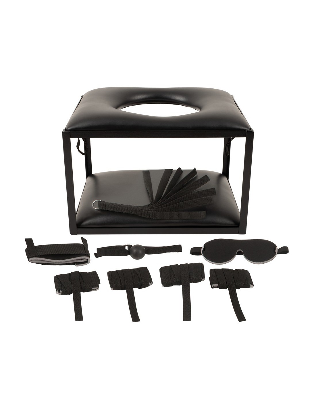Sex z solidną metalową ramą i wyściełaną poduszką siedziska oraz wyściełaną poduszką do leżenia. Poduszki pokryte są imitacją skóry, która jest łatwa do czyszczenia. Górna wyściełana poduszka ma otwór (? 23 cm) i jest idealna do fantazyjnych gier penetracyjnych i językowych. Może być również używany jako toaleta niewolnika. Pod tą poduszką znajdują się 4 bezpiecznie przymocowane oczka, w których można zamocować urządzenia przytrzymujące. 38,6 cm x 48,6 cm x 30 cm. Waga 10,5 kg. W zestawie 8-częściowy zestaw do różnych gier niewolniczych. Zestaw zawiera: