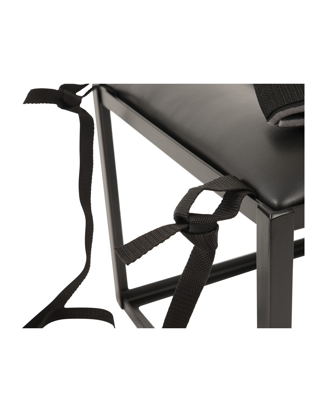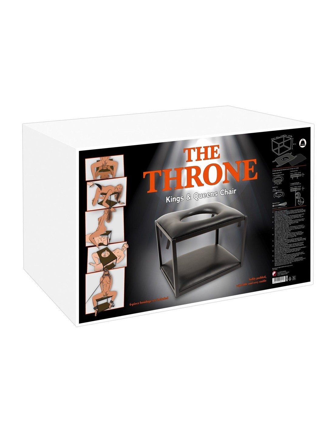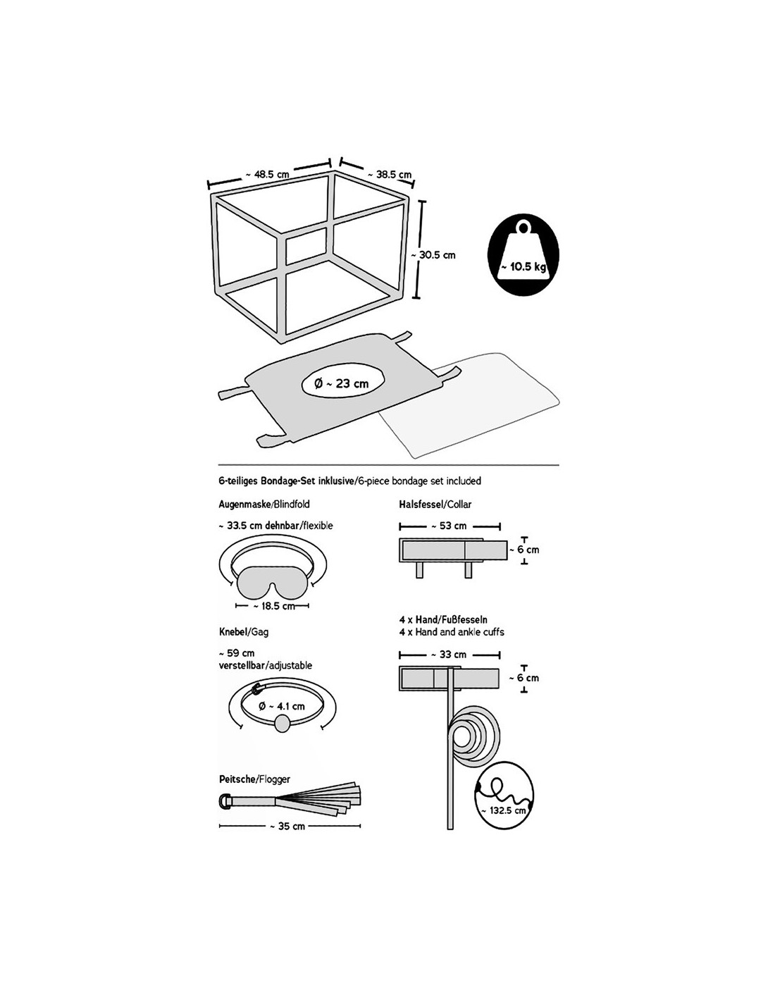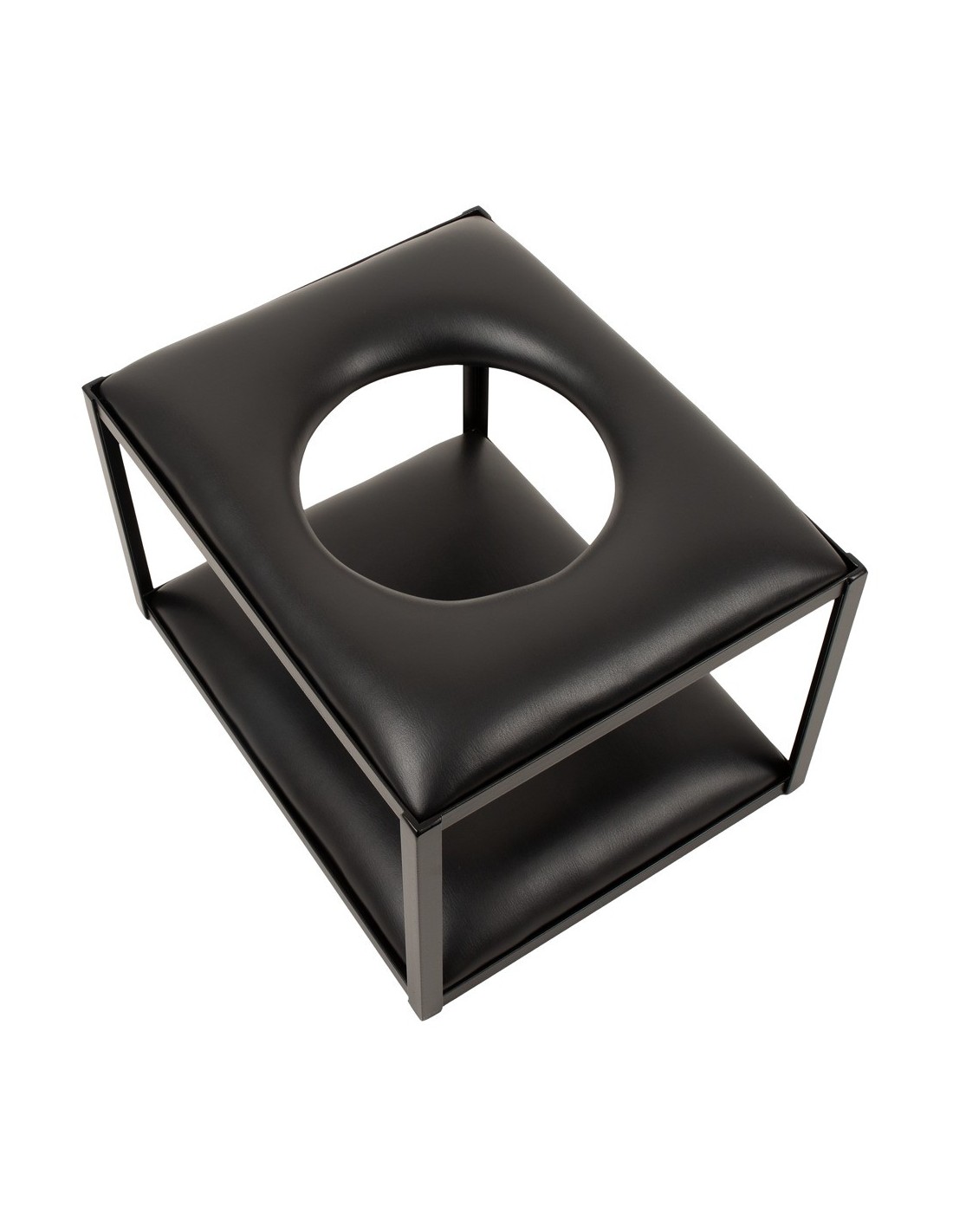 Sex z solidną metalową ramą i wyściełaną poduszką siedziska oraz wyściełaną poduszką do leżenia. Poduszki pokryte są imitacją skóry, która jest łatwa do czyszczenia. Górna wyściełana poduszka ma otwór (? 23 cm) i jest idealna do fantazyjnych gier penetracyjnych i językowych. Może być również używany jako toaleta niewolnika. Pod tą poduszką znajdują się 4 bezpiecznie przymocowane oczka, w których można zamocować urządzenia przytrzymujące. 38,6 cm x 48,6 cm x 30 cm. Waga 10,5 kg. W zestawie 8-częściowy zestaw do różnych gier niewolniczych. Zestaw zawiera: