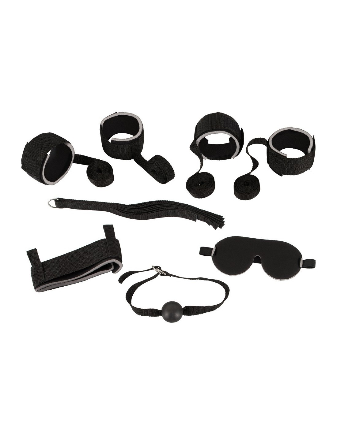 4 x kajdanki/mankiety na kostki (o szerokości 6 cm), wyściełane, z zapięciami na rzepy i paskami przytrzymującymi (każdy pasek o długości 126 cm).