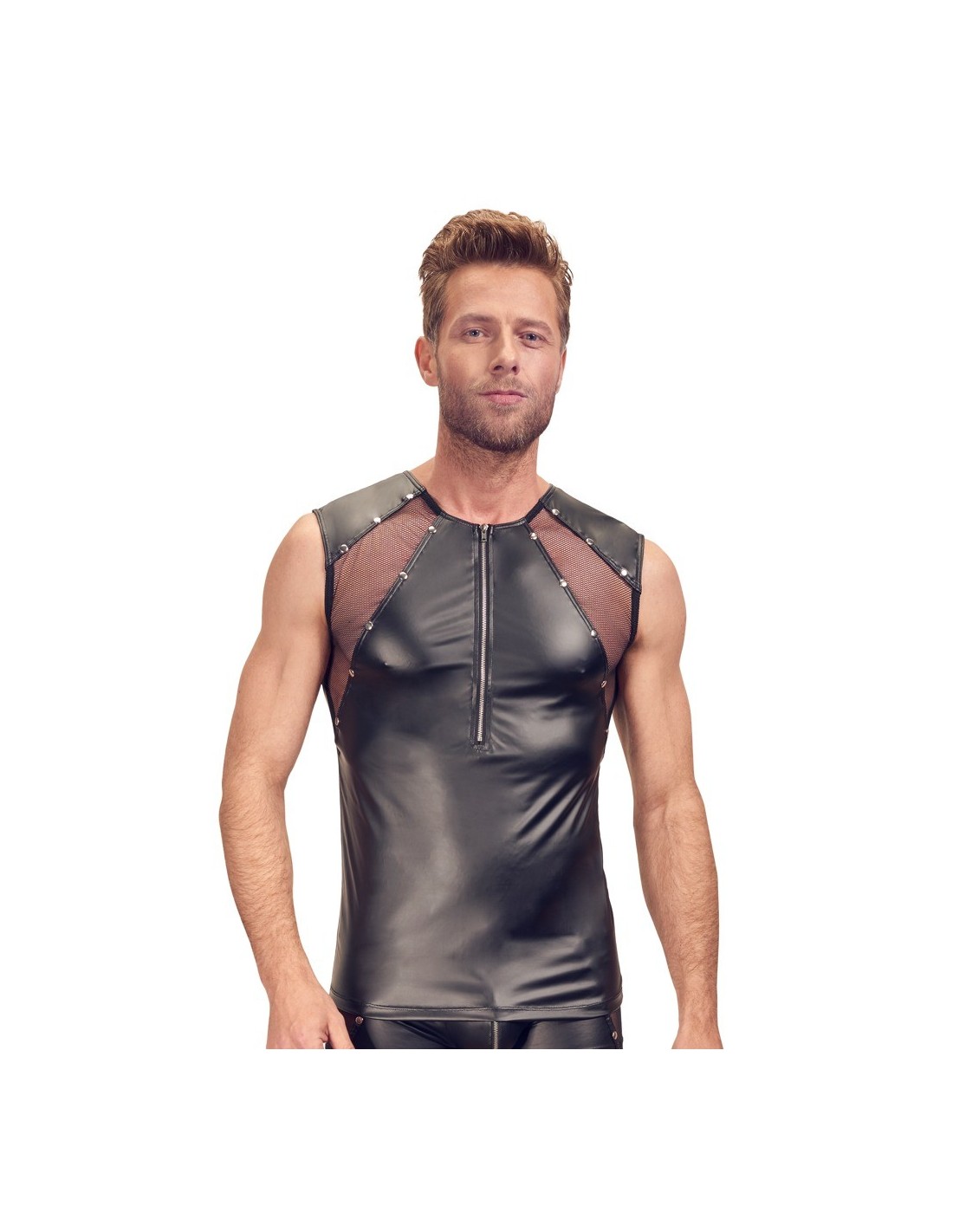 Nasza koszula została wykonana z elastycznego, czarnego, matowego materiału, który doskonale dopasowuje się do sylwetki. Dodatkowo, wstawki z siatki i efektowna dekoracja z ćwiekami nadają jej wyjątkowego charakteru. To niezwykłe połączenie sprawia, że nasz Klasyczny podkoszulek z zamkiem Men's Shirt S wyróżnia się na tle innych produktów na rynku.