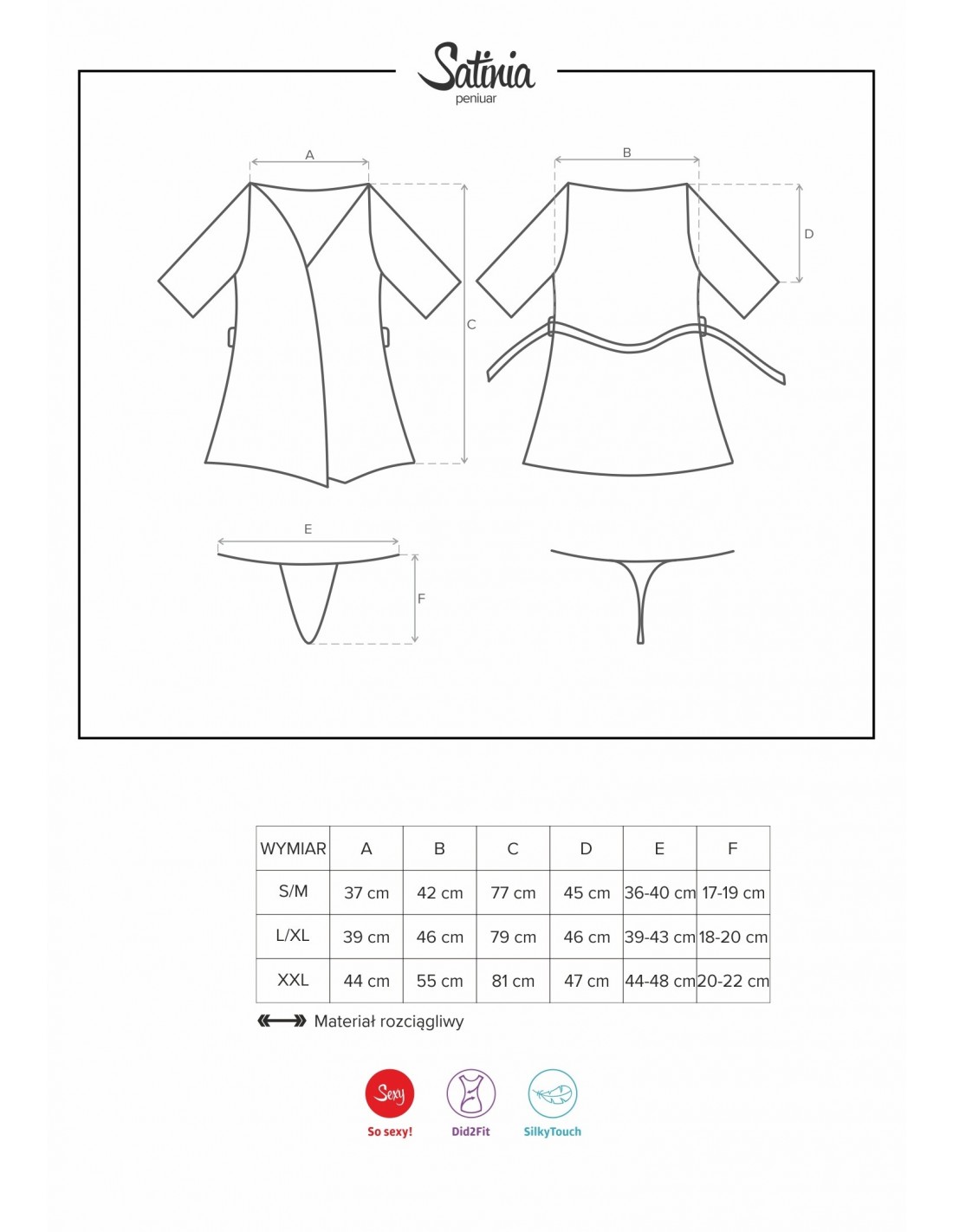 Szlafrok Satinia Czarny to połączenie stylu, wygody i uwodzenia. Wykonany z połyskującej tkaniny, ten szlafrok jest nie tylko piękny, ale także wygodny w noszeniu. Szeroki, satynowy pasek pozwala na łatwe dopasowanie do Twojej sylwetki i szybkie zdjęcie szlafroka w odpowiednim momencie. Rękawy o długości 3/4 dodają mu elegancji, a czarna gipiura na brzegach rękawów dodaje mu pikantnego akcentu. W komplecie znajdziesz również pasujące do szlafroka stringi, które podkreślą Twoje kobiece kształty. Materiał wykonany z 95% poliestru i 5% elastanu jest przyjemny w dotyku i delikatny dla Twojej skóry.